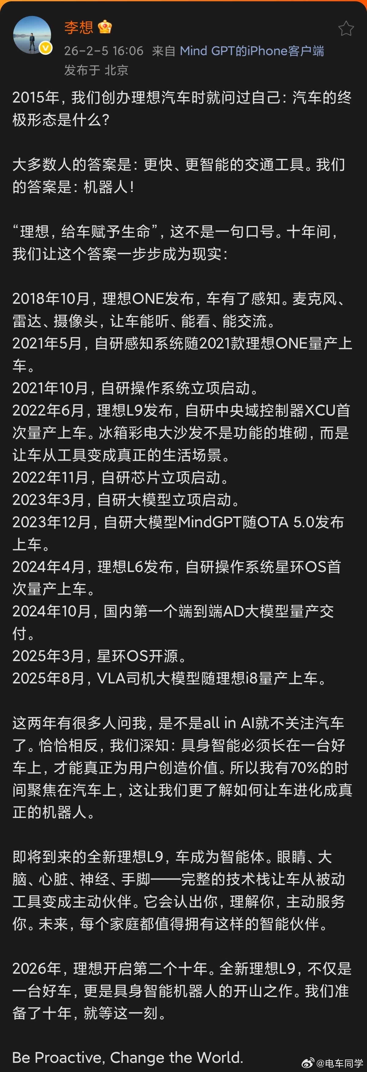 关于车最终会演变成一个什么样的载体?李想回答了他的想法,在AI的高速发展下,更类似载具机器人,贯穿你的生活、习惯、家庭、变成你的管家、甚至伙伴。