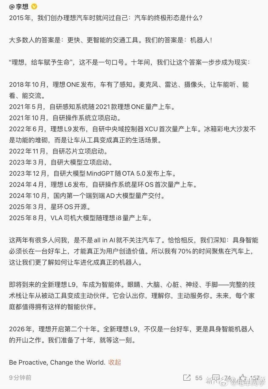 新出行社区 终于,李想本人开始预热全新理想 L9 了。和其他家以官图释放不同,这一次李想和大家聊了聊汽车的终极形态是什么?十年理想做了哪些技术积累以及全新理想 L9 和具身... 网页链接