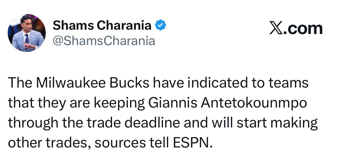 字母哥不走了!Shams:雄鹿已向各队表明,会在交易截止日前留住字母哥,球队接下来将推进其他交易操作。