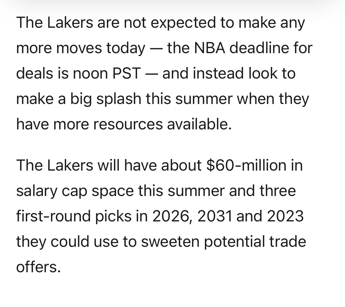 高歌猛进!湖人今夏将拥有约6000万美元的薪资空间,还手握2026、2031和2033年的三个首轮签,可用来为潜在的交易报价加码。