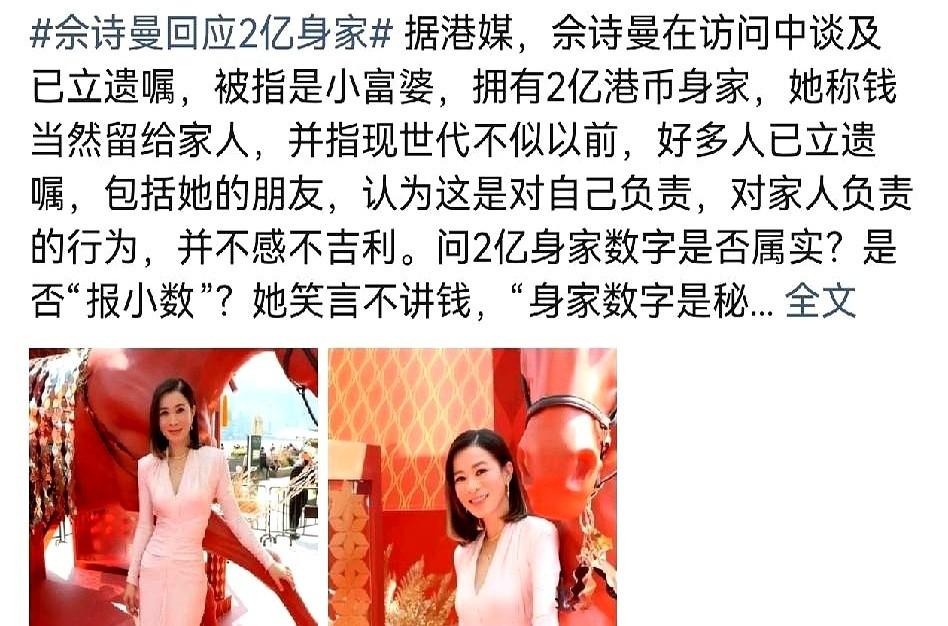 记者一个问题抛过来:“听说你身家过两亿,真的假的?” 50岁的佘诗曼,对着镜头没点头也没摇头,淡淡一笑,只说钱是给家人的。 但很多人不知道,她嘴里这句轻飘飘的“钱”,早就一笔一划写进了一份签好字的遗嘱里。 港媒说的两亿,其实只少不多。 西贡那两栋挨着的房子,一栋自己住,一栋给妈妈,推开窗就能互相打个招呼。山顶的复式大宅,是她犒劳自己的。跑马地和何文田的房子,每个月租金像工资一样准时打到卡上,让她压根不用操心现金流。 这还没算出场费,一场52万。也没算代言,两年600万。 可她没把这些数字当成炫耀的资本。 不是她想得多,而是身边的人一个个在离开,干爹走了,妈妈又查出重病需要人照顾,这让她结结实实地明白了一件事:人忙活一辈子,赚再多钱,最后要是没安排好,那都不是资产,是一堆麻烦和遗憾。 所以,她干脆把身后事提前办了。 遗嘱立好,律师归档。受益人那一栏,清清楚楚写着:妈妈,两个兄弟。 一个字都没提自己。 什么叫人间清醒?可能不是看你银行账户里有多少个零,而是早就想明白了,这钱,最后要给谁花。