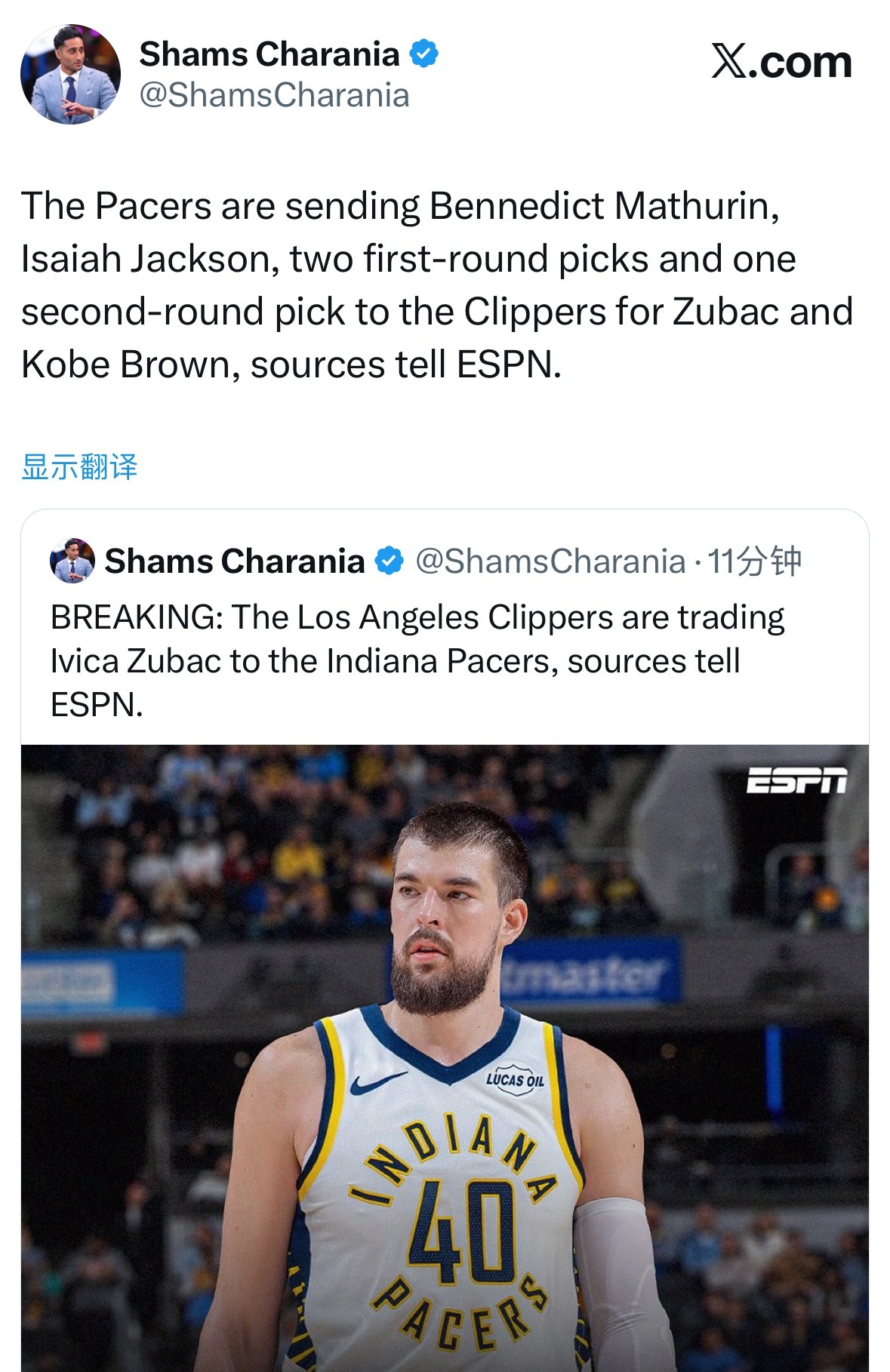 Shams:步行者送出马瑟林、以赛亚·杰克逊、两个首轮选秀权和一个次轮选秀权,从快船队换来祖巴茨和科比·布朗