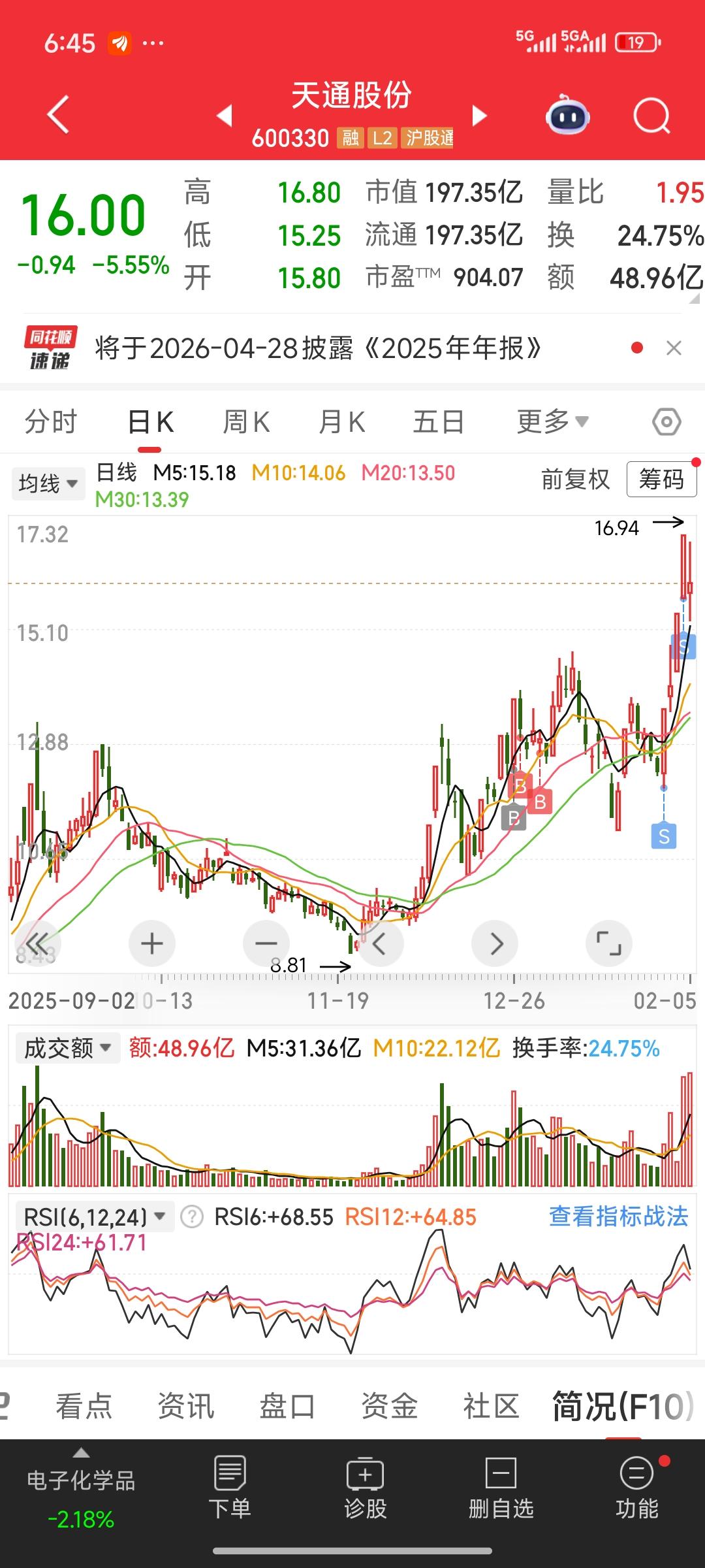 最近天通股份可谓是大涨了一番。虽说昨天大幅下跌回调,但这或许是上涨过程中的中继调整,毕竟在连收4个阳线后出现了第1根阴线。从昨天的走势图来看,应该是有游资介入。 巧的是,今天早上或者昨天傍晚传来好消息,中国电信和中国联通启动北斗短信服务,这直接利好天通股份。北斗短报文商用落地会带动射频芯片、通信模组需求激增,进而拉动上游压电晶体等关键材料的采购量。天通股份作为国内稀缺的压电晶体供应商,将直接受益于材料端的需求扩容,业绩增长具备确定性。 如此看来,天通股份今天有很大可能拉出大阳线实现反包。 天通卫星通讯 天通通信 天通通讯 天通卫星 天通基带芯片 通信天 线制造