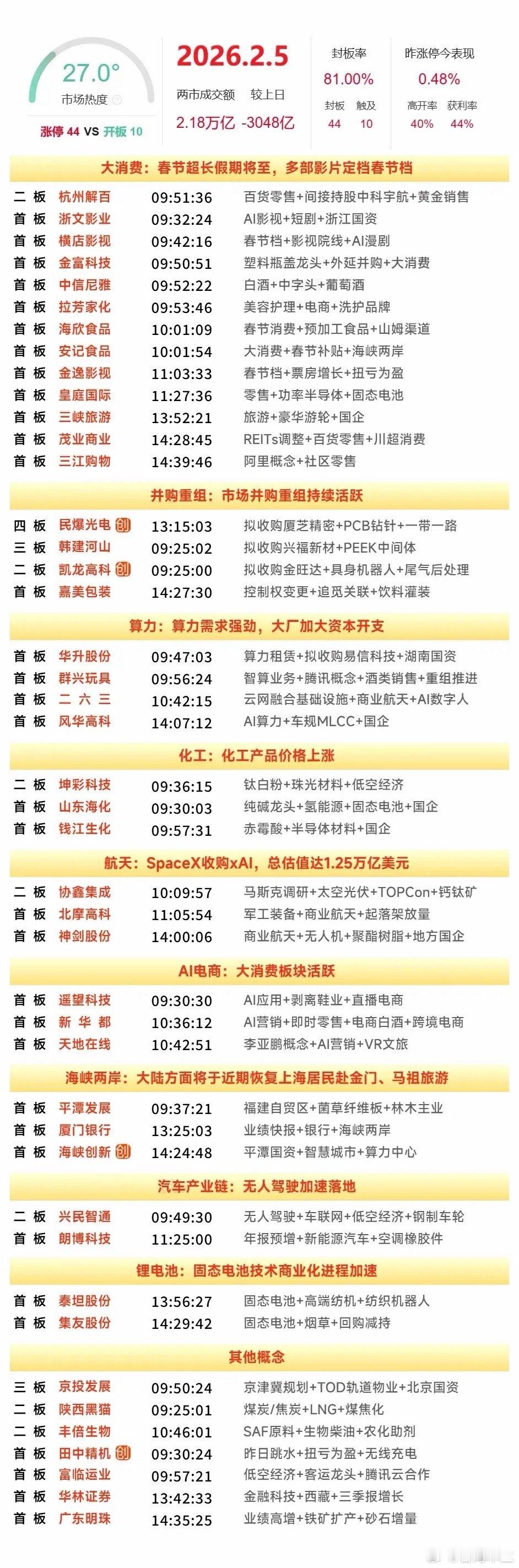 1、昨天的市场再次出现明显调整,比调整更扎心的是量能持续萎缩,市场整体成交额已经不足2.2万亿,创了今年来的新低,外围美股也持续下杀,黄金白银期货暴跌,整体就是明显的腥风血雨,而A股短线接力情绪持续暴击,短线轮动越来越快,很少有板块能够坚持两天,一旦调整,都是板块整体大幅调整,这样的行情下,短线操作难度是地狱级的,从情绪上看,短线思路真的要开始有所转变了!