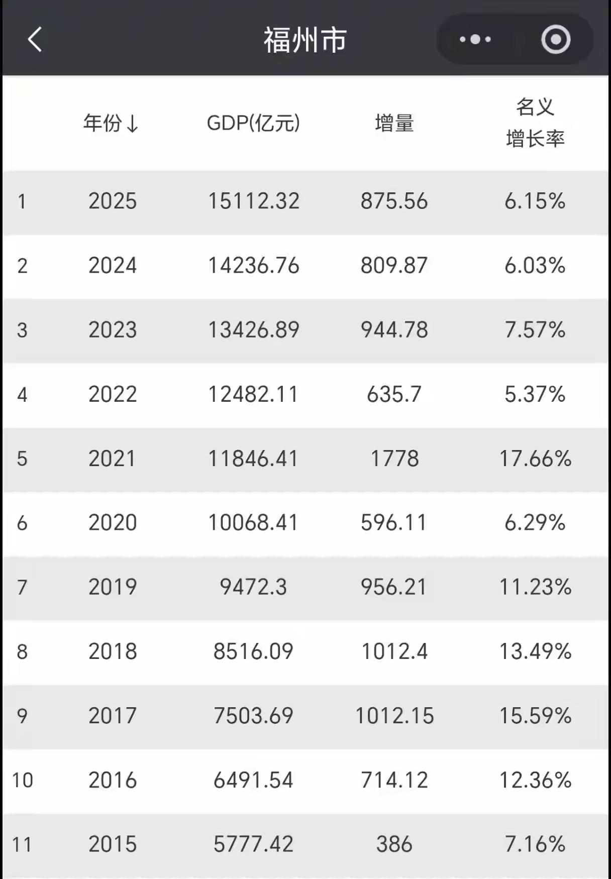 福州的经济发展也太有特色了嘛,一年一个台阶,从15年的5千多亿到25年的1万5千多亿,增长约3倍,一年上一个层次,是不是要不了几年就可以超过2万亿,成为东南地区经济发展的一面旗帜。