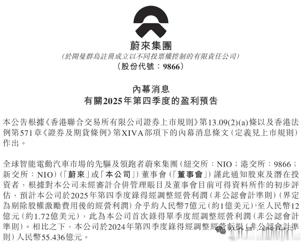 李斌昨天终于实现了多年前画的饼了!蔚来公司发布了2025年第四季度盈利预告,预告称:蔚来公司预计2025年第四季度录得经调整经营利润(非公认会计准则)约人民币7亿元人民币(约1亿美元)至12亿元人民币(约1.72亿美元)。蔚来汽车蔚来汽车盈利