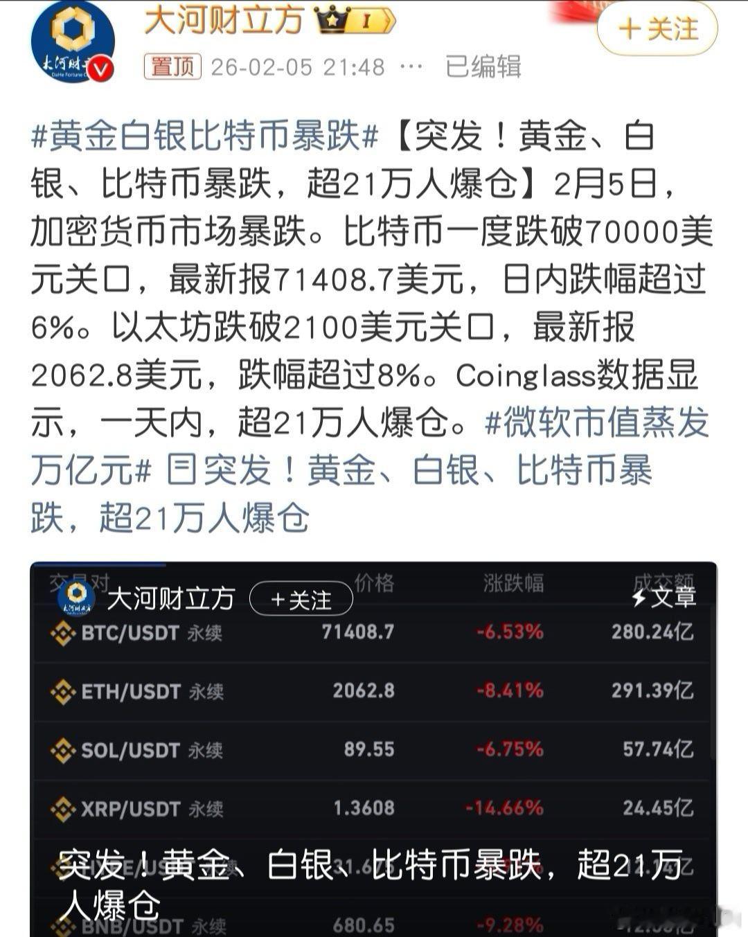 黄金白银比特币暴跌还有美国股市也是暴跌,世界怎么了? 本来总是会有一个是跌了另一个就会涨,现在三个全跌,没有避险手断了吗!