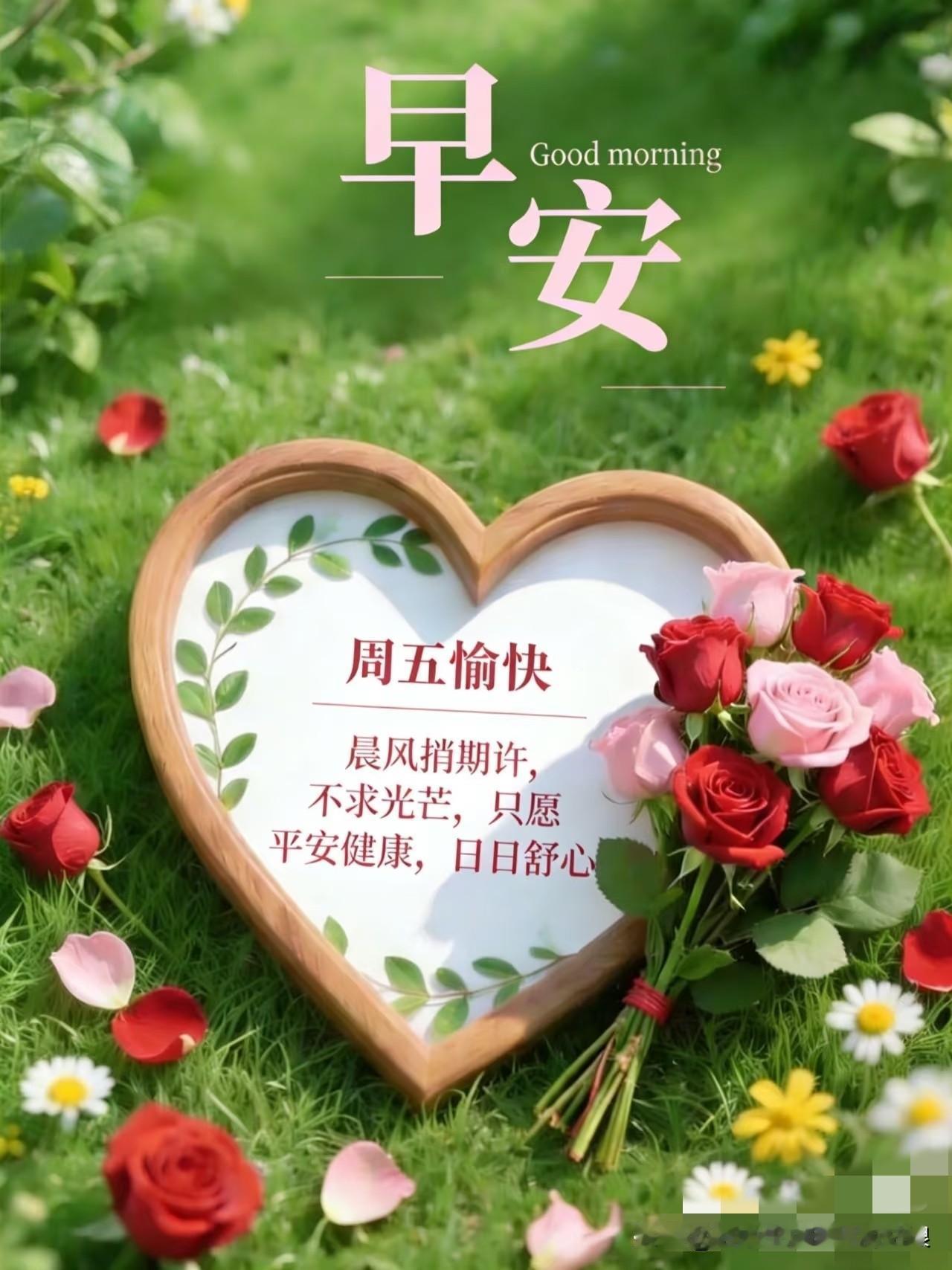 周五早安~清晨的微风捎来周末的讯号,吹散一周的疲惫与忙碌。愿你带着轻松的心情,奔赴今日的美好,事事顺意,步步欢喜。所有努力都有收获,所有期待都能成真,迎着阳光,温暖前行,周五快乐呀✨周五 早安