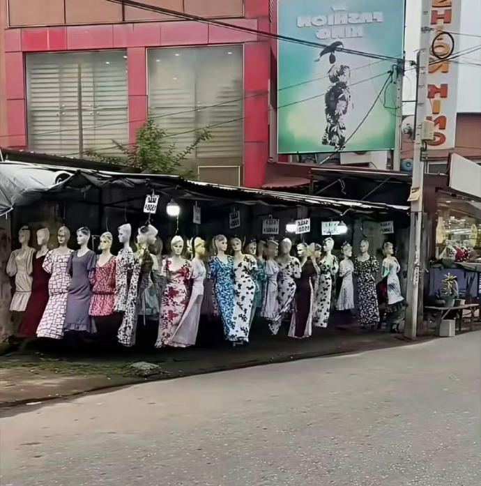 刚下班回家,天色有点暗,走到街角一抬头,好家伙,整个人直接愣在原地三秒钟![恐惧] 你们看这画面,一排排“人”就这么悬在半空,白花花的脸,还穿着花裙子。离远了看,真以为进了什么恐怖片现场呢。 走近了一看才发现,原来是个卖衣服的小摊。老板这创意也是没谁了,为了省地方把模特全吊起来了。 虽说生活不易,但这大晚上的,确实有点挑战路人的心理承受能力啊!大家说说,要是你半夜路过,你敢回头看吗?[捂脸] 街头见闻 生活百态 这创意绝了