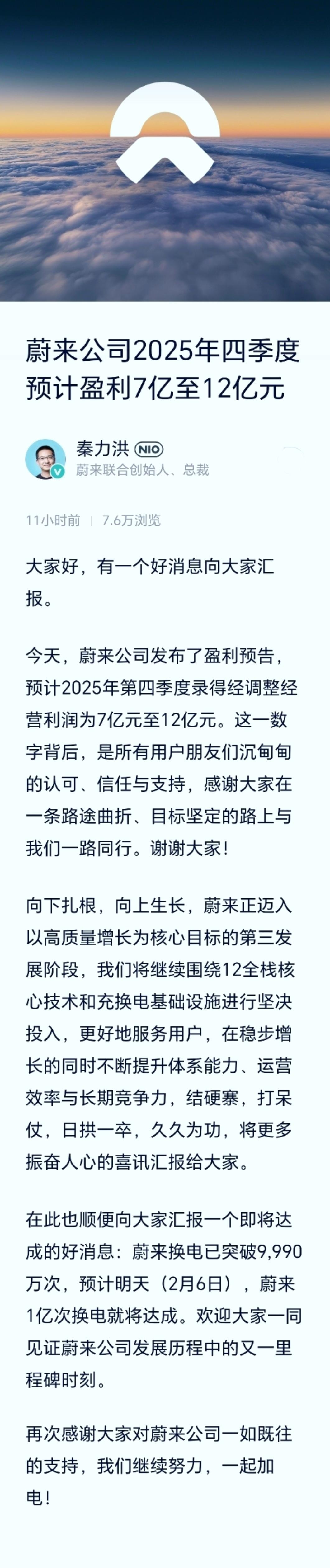 在厚厚暗暗的云层里穿行了很久很久,然后飞机突然向上飞出云层,此刻光阳万丈。 蔚来,首次,季度盈利了。