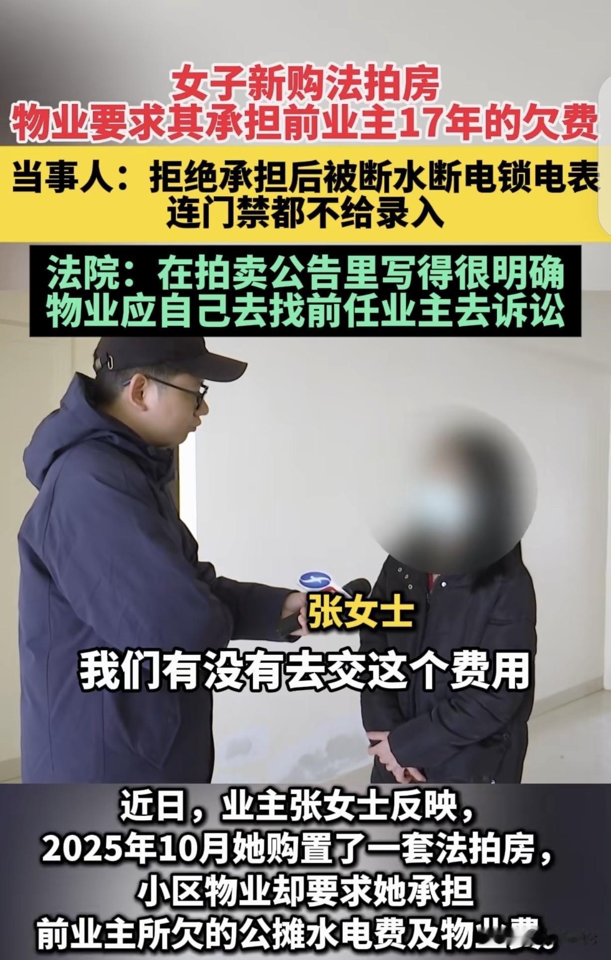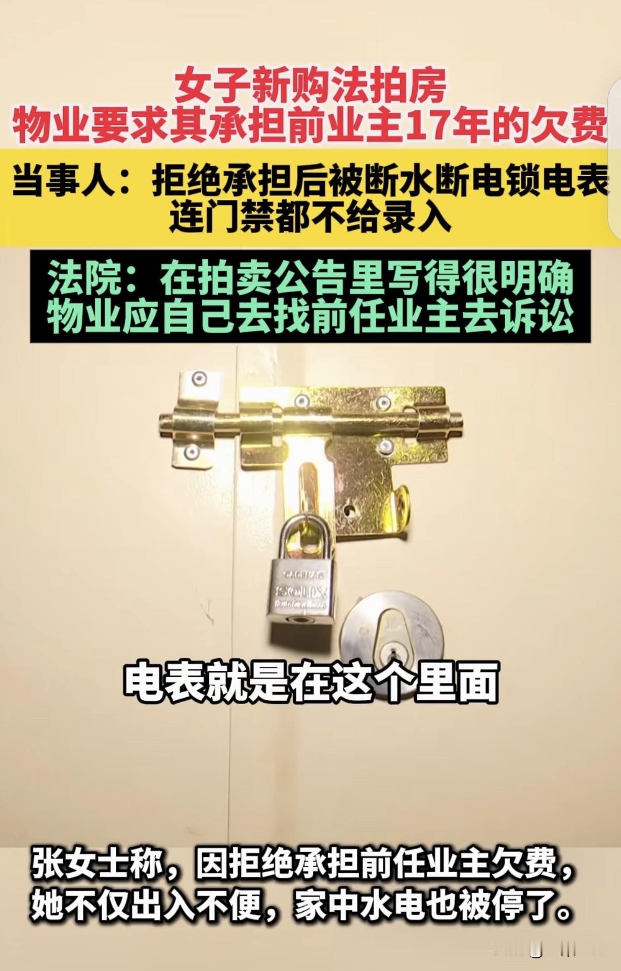 “太离谱了!”福建莆田,一女子买了套法拍房,刚搬进去,物业竟让她缴纳前业主拖欠17年的60000多物业费,女子直接拒绝,物业却断了水电,把电表也上锁了,不给她录门禁,还不承认自己做的龌龊事,说女子家用电量大,自己跳闸的。法院:物业去起诉前业主!网友:赶走物业,刻不容缓。 2025年10月,张女士买了套法拍房,她光图便宜了,却不知道接下来麻烦不断。 等张女士收拾好房子,欢天喜地乔迁新居后,楼下的楼管阿姨来到张女士家,说物业通知她去交物业费。 张女士顿时懵圈,自己才住进来,还没产生物业费,交哪门子费?难道这个小区规定提前缴纳物业费? 但楼管阿姨告诉张女士,说这套房子的前业主,欠了物业17年,累计60000多的物业费,她买了这套房子,就应该把这笔费用交了。 张女士简直不敢相信自己的耳朵,她凭啥给前业主擦屁 股?物业应该跟前业主要钱,关她什么事?她才不做这个冤大头,真是莫名其妙。 张女士拒绝缴费,可物业也不是好惹的,既然你不听话,那我有的是办法治你。 物业直接给张女士停了水电,还把她家电表给上锁了。 而且,你不是不缴费吗,那我也不给你录门禁,让你有家不能回,看谁耗的过谁。 可把张女士气坏了,真是把自己当软柿子捏了,别说她没这个义务给前业主收拾烂摊子,即使这笔物业费该她交,她不交时,物业也没资格停水停电来刁难她。 在张女士的不依不饶下,物业只把她家的水开了,但是电还不给开,居家过日子,断电怎么行?每天晚上乌漆麻黑的,走路都拌跟头。 但物业矢口否认断电,一口咬定是张女士家里用电量大,导致跳闸,跟物业无关。 家里没耗电量大的电器,压根不可能跳闸,张女士知道物业在使绊子,你们物业都把电表上锁了,还死不承认。 女子也不是吃素的,直接找来媒体进行报道,她之所以这么硬气,是因为从法院拍来这套房子时,拍卖确认书白纸黑字写着,影响标得物使用的水、电,等欠费有买受人承担。 被执行人拖欠的物业管理费,由物业公司跟前业主要,张女士只需要承担前业主欠的公摊水电费就行。 律师也说,如果没有法律规定,或者合同约定,前业主拖欠的物业费,是不能转嫁给新业主的。 有人说,法院拍卖前肯定已经调查过已经欠物业费的,应该从拍卖款中扣出费用支付物业费,新业主拍卖前也应该到物业公司了解情况才参与拍卖。 物业以“前业主欠费”为由断水断电、限制门禁,本质是利用管理权胁迫业主就范。 法拍房交易中,物业费承担主体本应通过司法拍卖公告明确,如果公告没约定,新业主无义务为前业主“买单”。 物业长期没追缴旧债,却在新业主入住时突然发难,暴露管理失职与服务意识缺失。 更恶劣的是,物业以“跳闸”等借口掩盖违法行为,既不专业也不诚信,严重损害行业形象。 从法律层面看,物业与业主是服务合同关系,无权通过断供基本生活资源催费。 此事件中,物业不仅越权,还涉嫌侵犯业主财产权,电表上锁和居住权,门禁限制,已超出合理维权范畴。 网友呼吁“赶走物业”虽情绪化,但折射出公众对物业乱象的深恶痛绝。行业需建立信用黑名单制度,对违规物业实施市场禁入。 《民法典》第944条规定:物业服务人不得采取停止供电、供水、供热、供燃气等方式催交物业费。 本案中,物业以“前业主欠费”为由断水断电,直接违反该条款。 首先,物业非供水供电合同主体,无权中断服务;其次,即使业主欠费,物业也应通过诉讼等合法途径追偿,而非滥用管理权。 法院明确“物业应起诉前业主”,正是依据此条款否定物业转嫁债务的合法性。 此判决为类似纠纷树立标杆:物业必须回归“服务者”本位,任何越权行为都将受到法律制裁。 对于这件事,你怎么看? 欢迎关注@一案一论