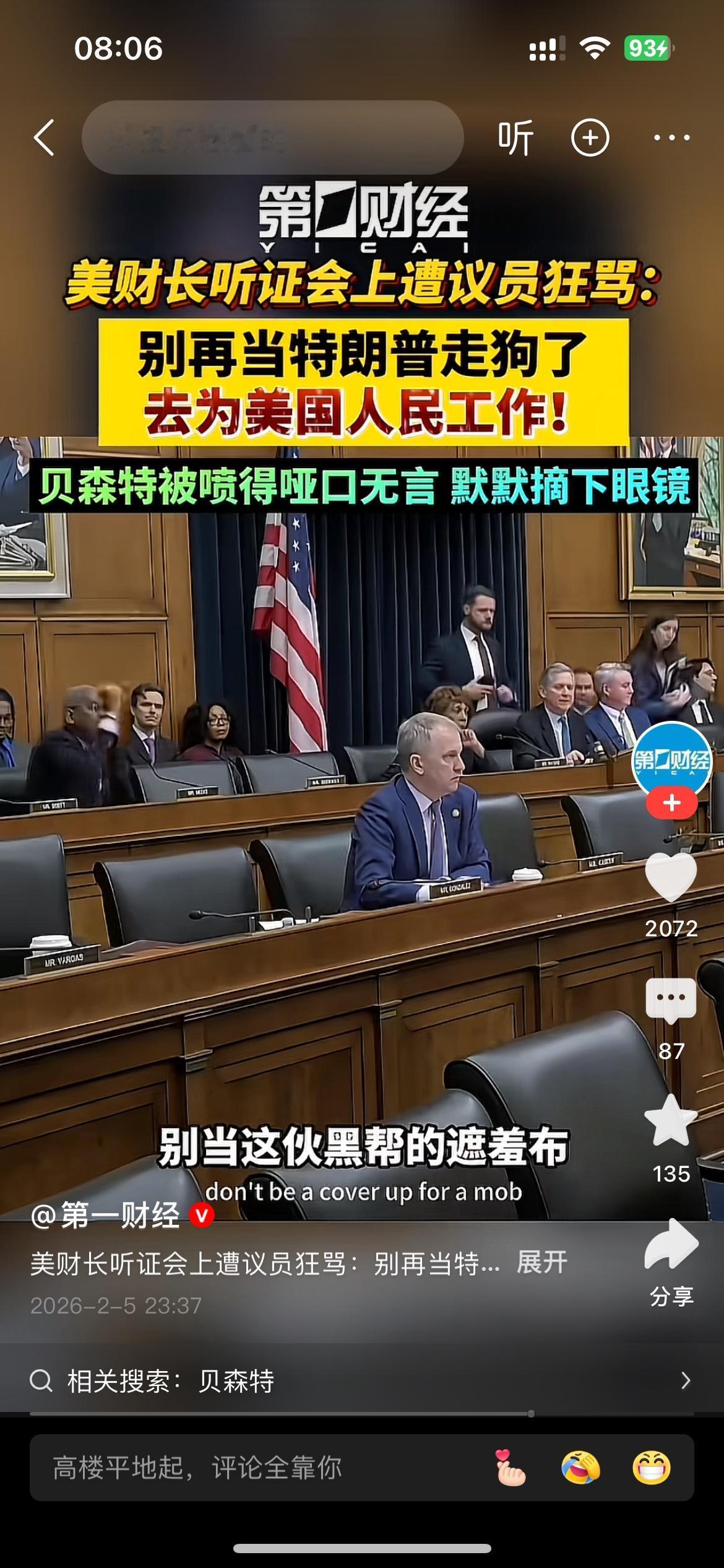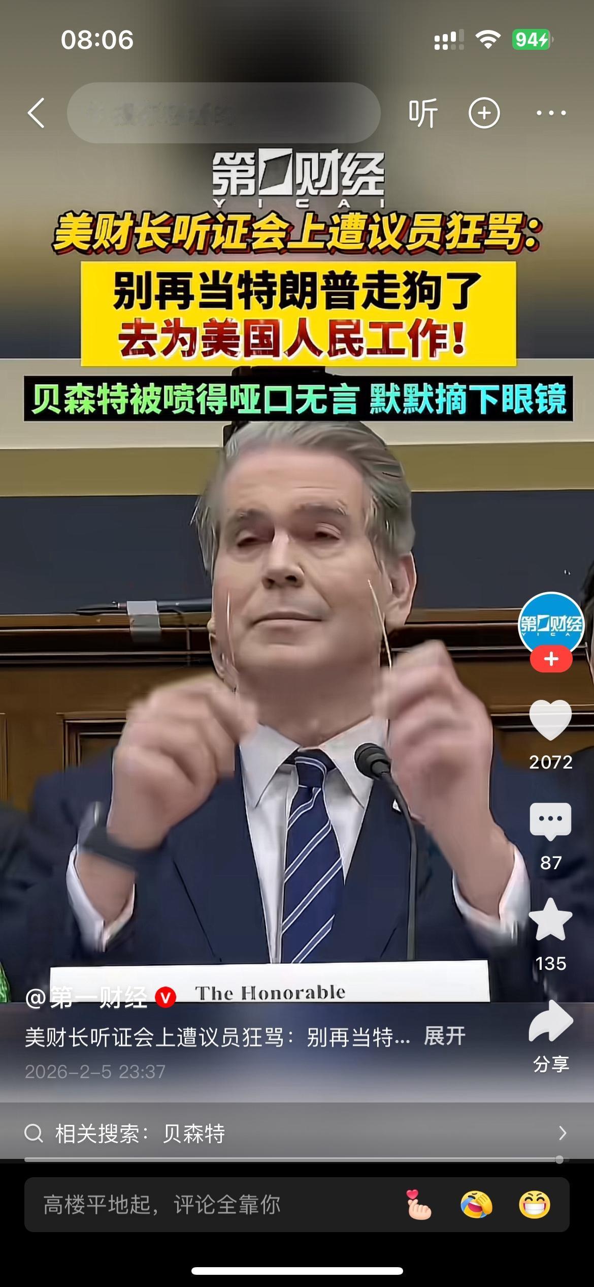 贝森特在听证会上遭怒骂之后,虽被怼的哑口无言,但是更多的是无所谓的,轻轻摘掉眼镜,一脸傲娇,有种“事了拂衣去”的感觉! 毕竟被议员骂了就骂了,要是得罪了特朗普,有可能财政部长的位子不保,贝森特还是分的出来轻重呢!