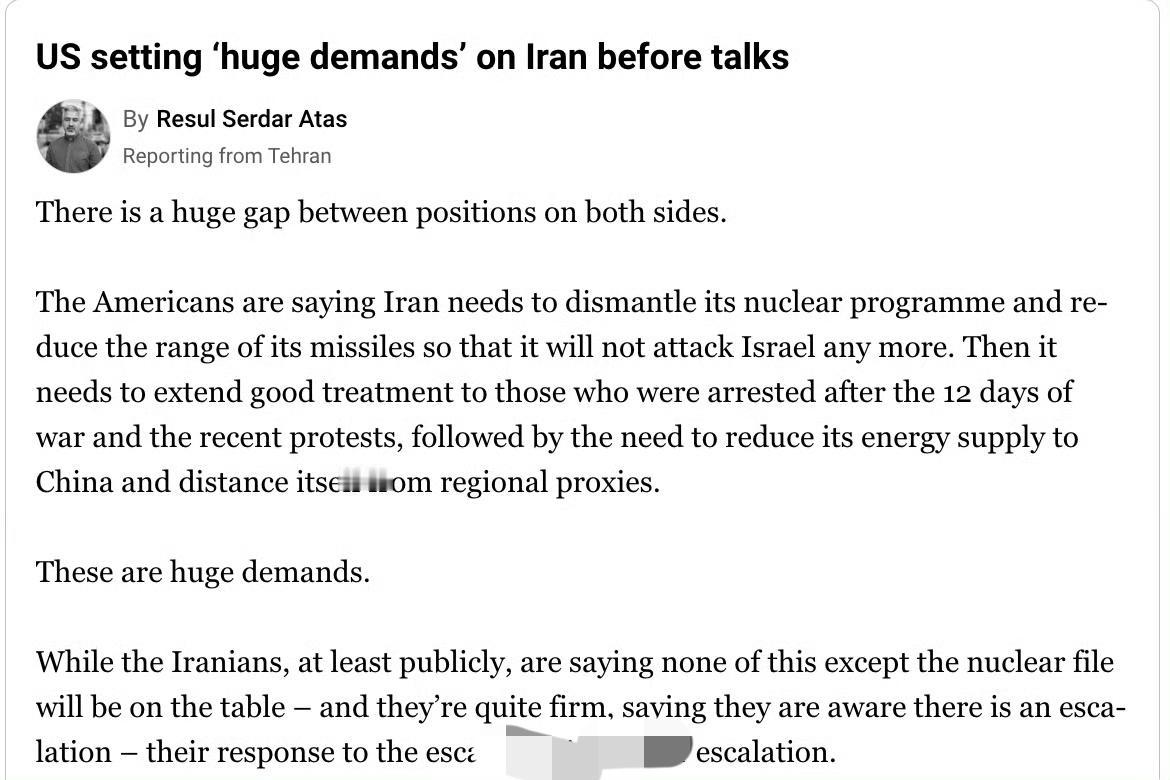 中美没得好谈的了! 据半岛电视消息:美国给出的条件是,不仅要求伊朗放弃其核计划、限制导弹射程、停止对以色列的威胁、释放近期抗议活动拘捕者。 而且还希望伊朗切断与中G的能源往来,并与该地区的代理人保持距离。 可见,特朗普如今是事事处处都离不开针对中国。如今一是航道封控,二是拉小圈子孤立,三是放虎归山,四是打击我全球伙伴等等。 他妄图通过这些方式,在中东地区乃至世界各地进一步孤立中国,打压中国的能源利益,遏制中国的发展势头。 而中美之间,若美国始终抱着这种霸权心态和遏制思维,那确实很难有真正建设性的对话。 就看四月的访问吧,中美之间有没有大交易,不然可该我们反击了。相信世界各国也不会傻乎乎的去帮美国。如今又到了与美决战的时候了。很多时候一味的逃避躲闪不是办法。找准时机集中力量怼他一次,让他滚回美国去!