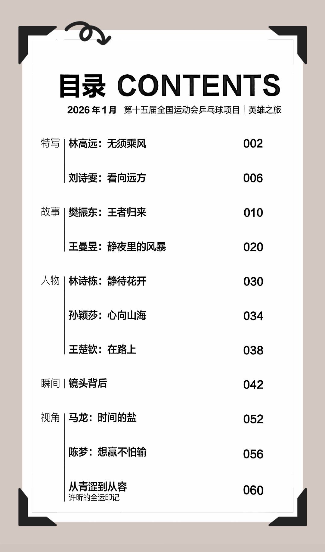 《中国体育》2026年1月刊 🏓 十五运英雄之旅樊振东:王者归来王曼昱:静夜里的风暴林高远:无须乘风刘诗雯:看向远方林诗栋:静待花开孙颖莎:心向山海王楚钦:在路上马龙:时间的盐陈梦:想赢不怕输许昕:从青涩到从容