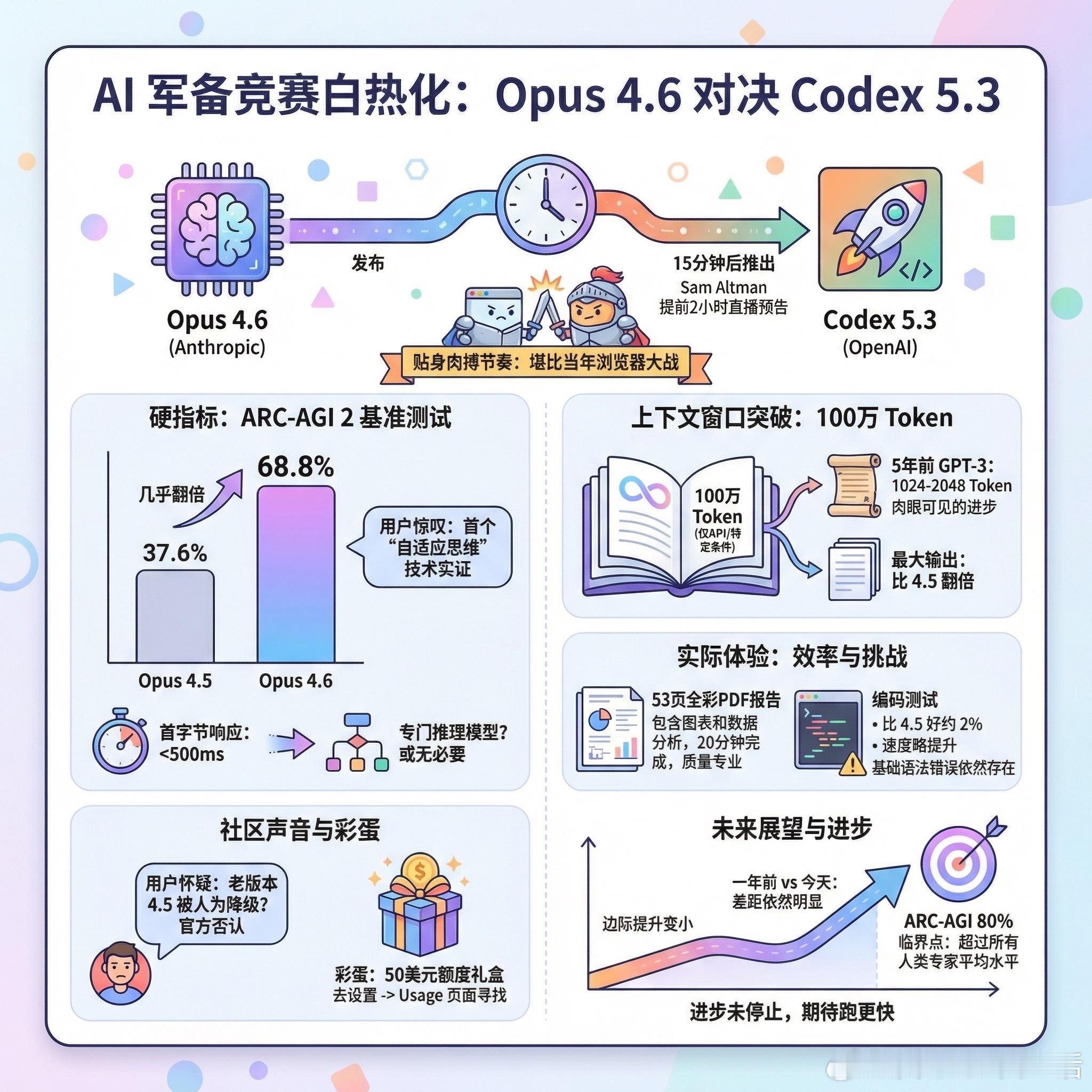 Anthropic刚发布Claude Opus 4.6,OpenAI就在15分钟后推出Codex 5.3。Sam Altman甚至提前两小时预告直播,明显是要抢风头。这种贴身肉搏的节奏,让人想起当年浏览器大战的味道。