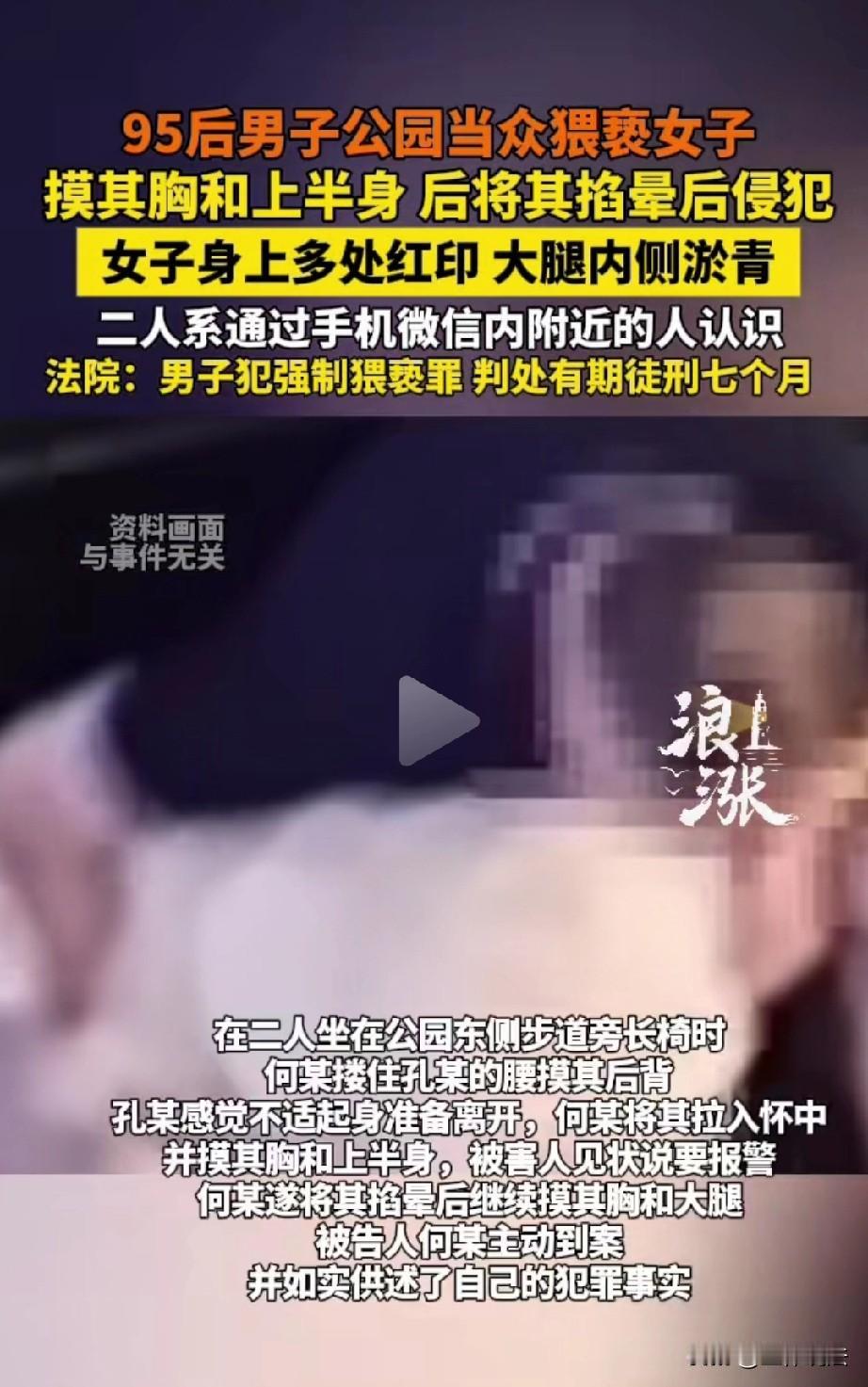 胆子太大了!安徽马鞍山,95后男子通过“附近的人”认识了女子,两人聊了几天后便相约在公园见面。谁知,刚坐下,男子的手就开始不老实,搂住女子的要开始摸其胸部。女子吓一跳想要挣脱,谁知男子恼羞成怒,将其吓晕后继续实施侵犯。女子醒来后发现自己身上多处红印且大腿内侧淤青,果断报警。 95后男子何某单身,他经常通过网聊打发时间,排解寂寞。 去年,他通过手机微信“附近的人”功能,认识了女子孔某。两人短暂聊了几天后,何某便邀请孔某一起去公园游玩。 孔某想着,两个人还算聊得来,交个朋友多条路嘛,便答应了。 3月22日下午四点多,何某骑着电动车带着孔某来到公园,找了个东侧步道旁的长椅坐下。 刚开始,两人还正常地聊着天,可没过一会儿,何某就露出了不轨之心,他突然按住孔某的腰,伸手去摸她的后背。 孔某一下子就感觉不对劲,这种行为让他十分不舒服,第一次见面,这人怎么如此不尊重自己,便赶紧起身,准备离开。 何某哪肯轻易放过她,一把将她拉入怀中,接着就开始摸她的胸部和上半身。 孔某又气又急,全力反抗,并威胁他,说再不停手自己就要报警。 听到孔某要报警,公园又有人,他怕引起不必要的麻烦,何某竟然恼羞成怒,双手用力掐住她的脖子,不一会儿,孔某就因为缺氧晕了过去。 等孔某恢复意识,发现何某的动作还没停,事后,自己身体多处疼痛,身上留下了多处红印,大腿内侧还有淤青。 孔某又怕又羞,没想到,见个网友,不仅丢了清白不说,差点连小命都搭上,她等何某稍微松懈,果断挣脱后报了警。 很快,何某主动到案,并如实供述了自己的犯罪事实。 事后,何某的家人代他对孔某进行了经济补偿,希望能得到孔某的谅解。孔某考虑到何某家人诚恳的态度,最终表示愿意谅解何某。 法院经过调查审理,明确何某在公园这一公共场所,违背孔某意愿,先以搂抱、摸胸等方式实施猥亵。 在孔某反抗并报警威胁后,恼羞成怒用掐脖子的暴力手段致其昏迷,继续实施侵害。 该行为明显属于以暴力手段强制猥亵妇女且情节恶劣,已超出一般治安违法范畴,构成刑事犯罪。 《刑法》第237条规定:以暴力、胁迫或者其他方法强制猥亵他人或者侮辱妇女的,处五年以下有期徒刑或者拘役。聚众或者在公共场所当众犯前款罪的,或者有其他恶劣情节的,处五年以上有期徒刑。 但事后,何某主动到案并如实供述,构成自首;其家属积极赔偿并取得被害人谅解,属于法定与酌定从轻情节。 结合其犯罪情节、危害后果及悔罪表现,最终,法院以强制猥亵罪,判处何某有期徒刑七个月。 女孩子一定要记住,网上聊得再好也别轻易单独见网友,知人知面不知心。 见面地点别选偏僻地方,保持警惕,遇到不对劲赶紧远离、及时求助。学会保护自己。
