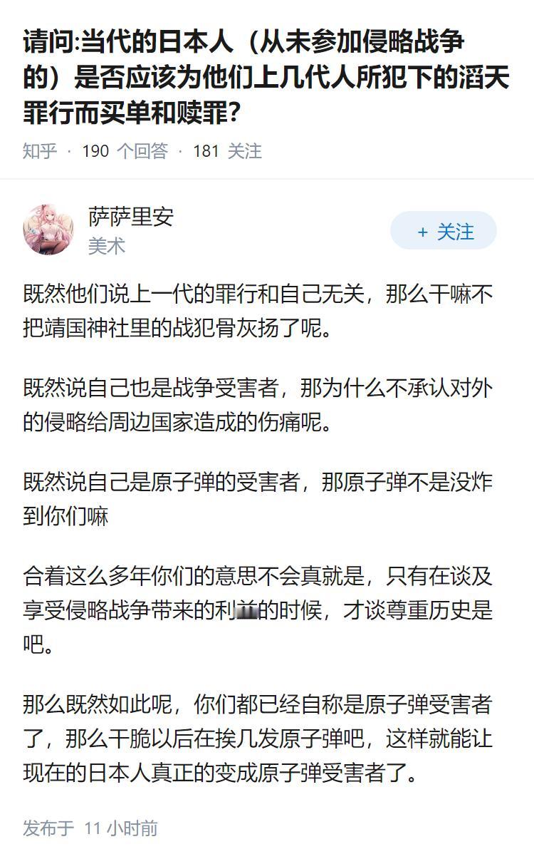 请问:当代的日本人(从未参加侵略战争的)是否应该为他们上几代人所犯下的滔天罪行而