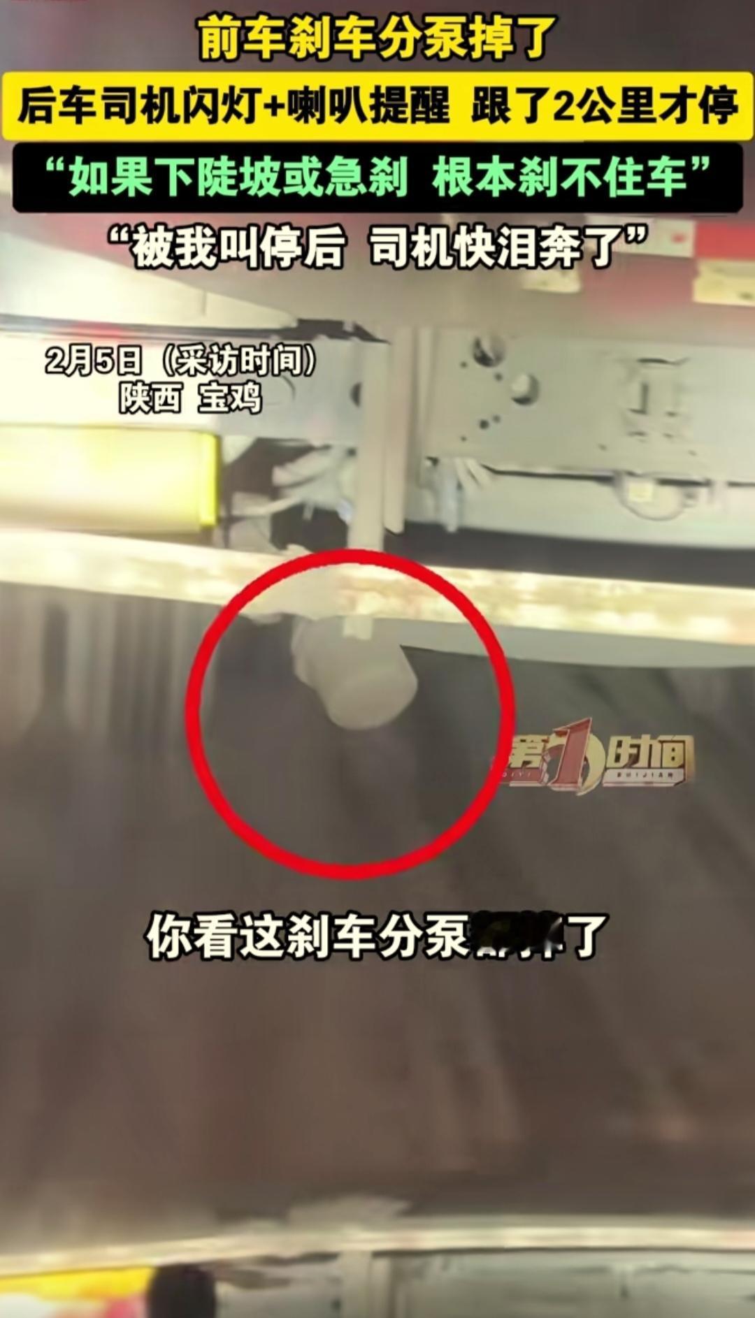 陕西宝鸡,一位热心司机在310国道行驶时,看到前面大货车的刹车分泵掉了,他鸣喇叭用灯语向货车示警。货车停下后,货车司机得知原委,感动得几乎泪奔,非常感谢后车司机的热心提醒。 我不知道啥是刹车分泵,也不知道它掉了有啥危险,就搜了下:刹车分泵掉落会导致刹车油瞬间泄漏,使整个刹车系统泄压。可能会刹车失灵或失效,损害车辆其他部件,使车辆失控。在陡坡或紧急情况下尤其危险。 原来刹车分泵掉落这么危险,怪不得货车司机感动得要哭。 大货车司机真是幸运,遇到的是位热心司机,还是位老司机,一般人就是看到了也不认识,也就不会提醒他了。 春节快到了,大家都想着阖家团圆,开开心心过新年。 在外奔波的司机朋友们,一定要注意安全呀。出发前多检查,路上多警醒,察觉车辆有异常立即停车检查。出门在外,安全这根弦,一刻也不能松。 信息来源:AHTV第一时间