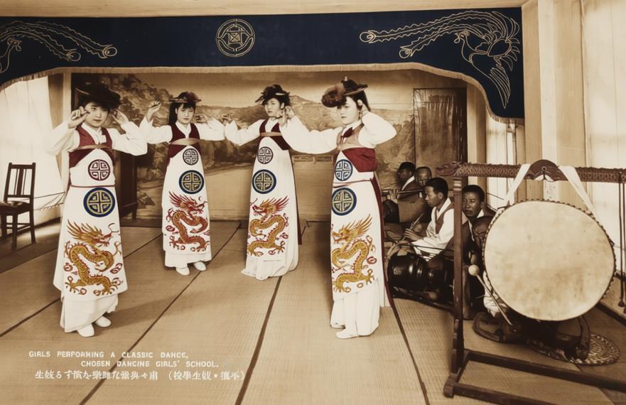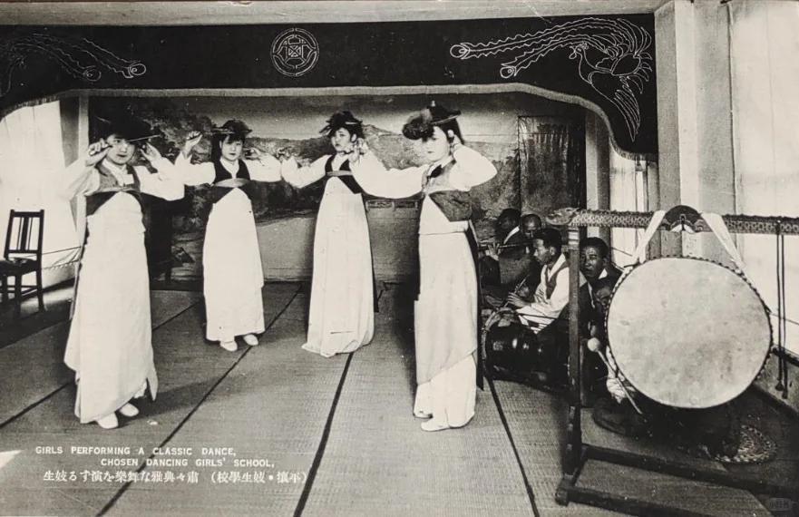 20世纪上半叶,日本殖民朝鲜时期,平壤(当时被日本称为“京城”)“朝鲜妓生学校”(Chosen Dancing Girls' School)的一场传统舞蹈表演。 四位妓生学员身着朝鲜传统舞服,上穿短襦、下着长裙,正在舞台上演绎经典宫廷舞蹈。她们动作优雅且整齐划一,手臂姿态舒展,展现出经过专业训练的美感。舞台右侧,几位乐师正围坐演奏,一旁摆放的朝鲜传统大长鼓,是这场表演的核心伴奏乐器。 明信片上的英文与日文标注,如“GIRLS PERFORMING A CLASSIC DANCE”和“妓生るす演た楽舞な雅典々(校學生妓・攘平)”,直接点明了这是妓生学校的经典舞蹈演出。