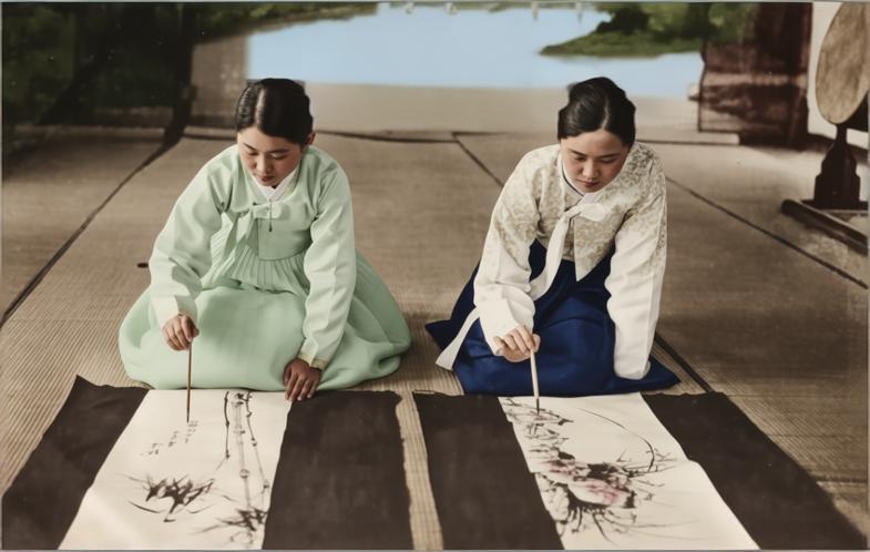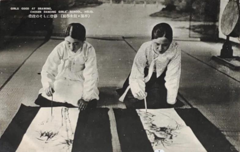 20世纪上半叶,日本殖民朝鲜时期,平壤(当时被日本称为“京城”)“朝鲜妓生学校”里的绘画课堂。 两位妓生学员身着朝鲜传统白衣,正跪坐在榻榻米上专注地进行水墨画创作。她们手持毛笔,在铺于地面的画纸上挥毫,纸上已经呈现出花鸟、草木的雏形。 明信片上的英文标注“GIRLS GOOD AT DRAWING, CHOSEN DANCING GIRLS' SCHOOL, HEIJO”和日文标注“(校學生妓・攘平) 移習にもその技芸な妓生”,直接点明了这是妓生学校的绘画训练,强调了学员们兼具多种艺术才能。