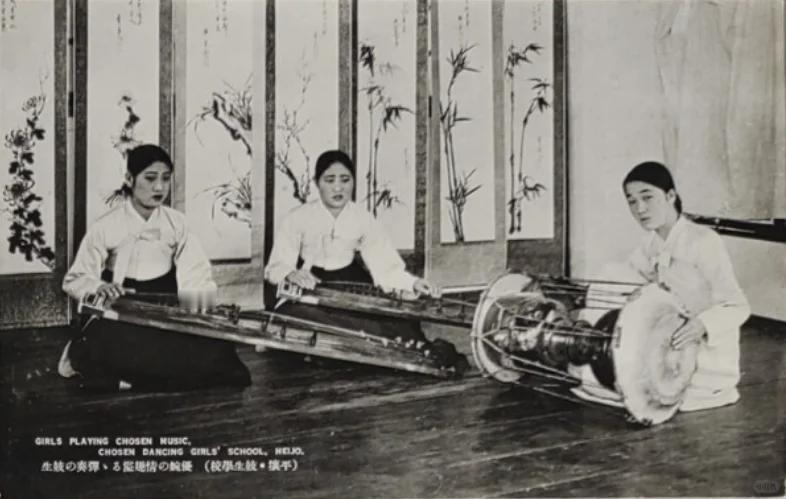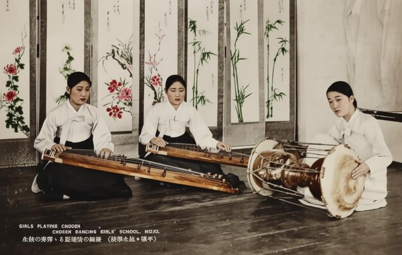 20世纪上半叶,日本殖民朝鲜时期,平壤(当时被日本称为“京城”)“朝鲜妓生学校”的本土音乐演奏场景。 三位身着传统白衣黑裙的妓生学员跪坐于木地板上,专注地演奏着朝鲜本土乐器:左侧两人弹拨音色清雅的伽倻琴,右侧一人敲击节奏明快的长鼓,身后的梅兰竹屏风则为场景增添了雅致的传统氛围。