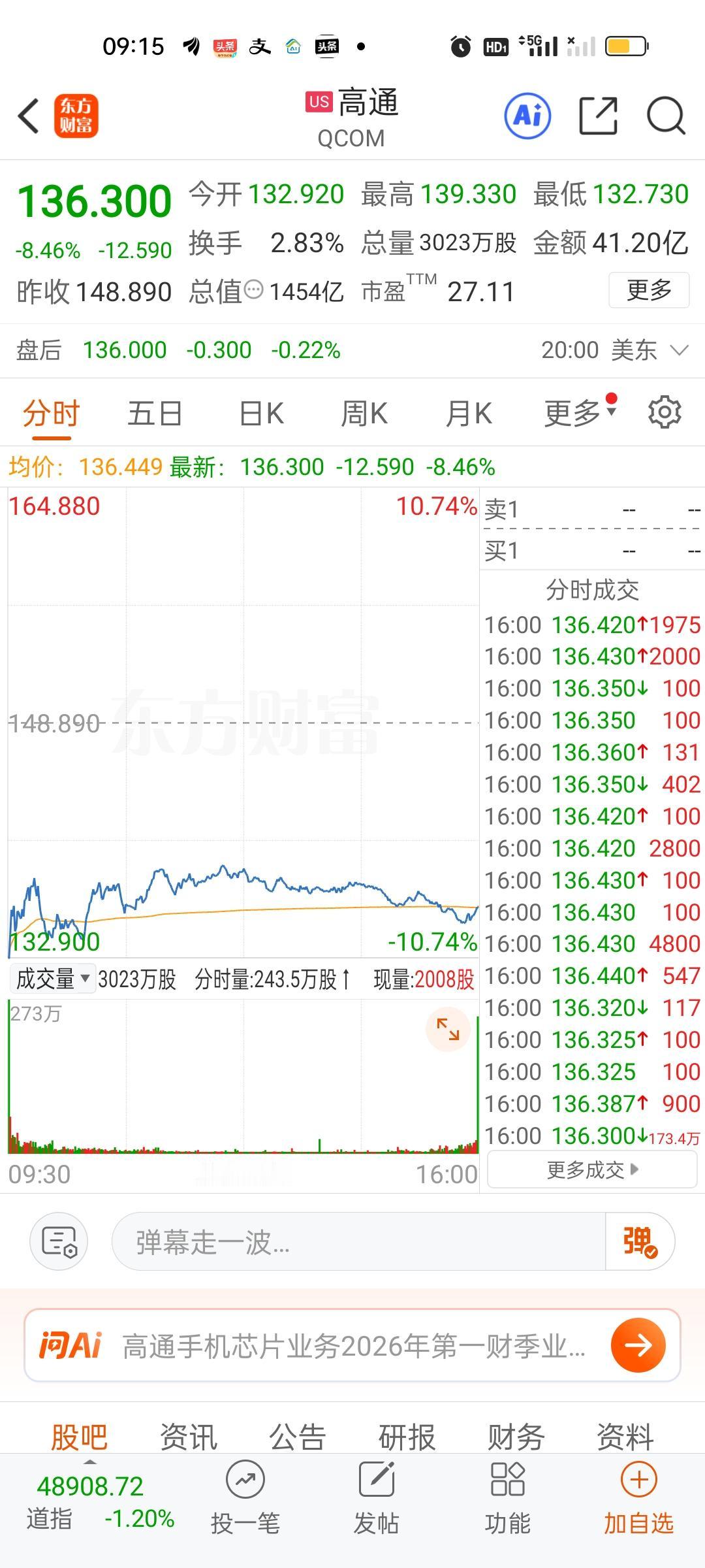 美股商航板块又是暴跌的状态,这可不是好消息。高通也大跌了8.46%,微软,AMD,特斯拉,存储芯片跟跌。现在市场对科技的下杀很厉害。