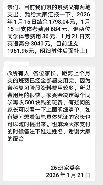 家长举报家委会3年收10多万元班费家委会收班费初衷是好的,但3年收10多万也太夸张了!义务教育还反复收费,算下来全班40人,人均一年800多,钱花哪了也不透明,普通家庭真扛不住。