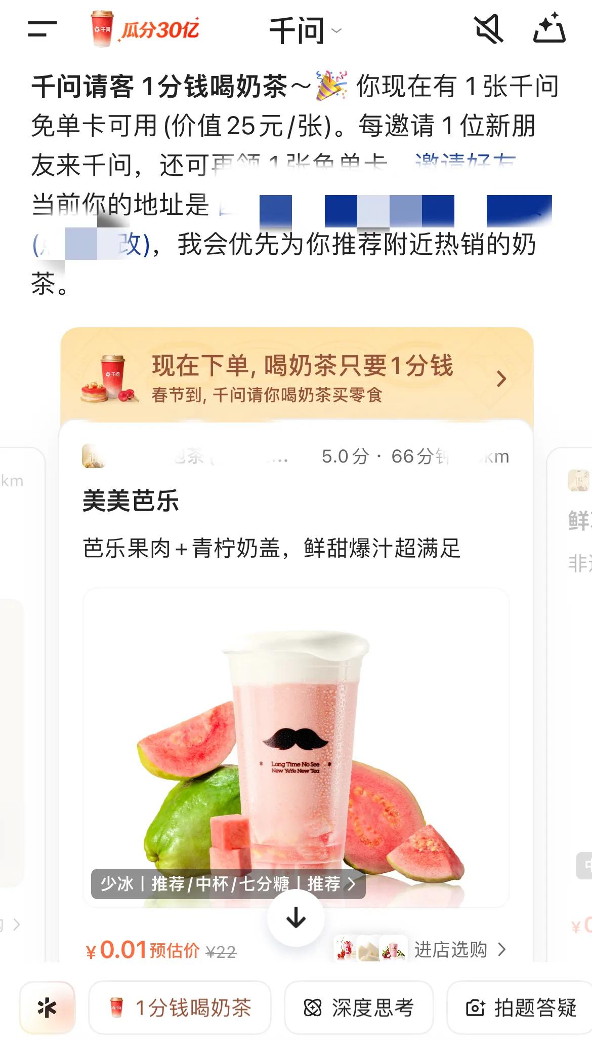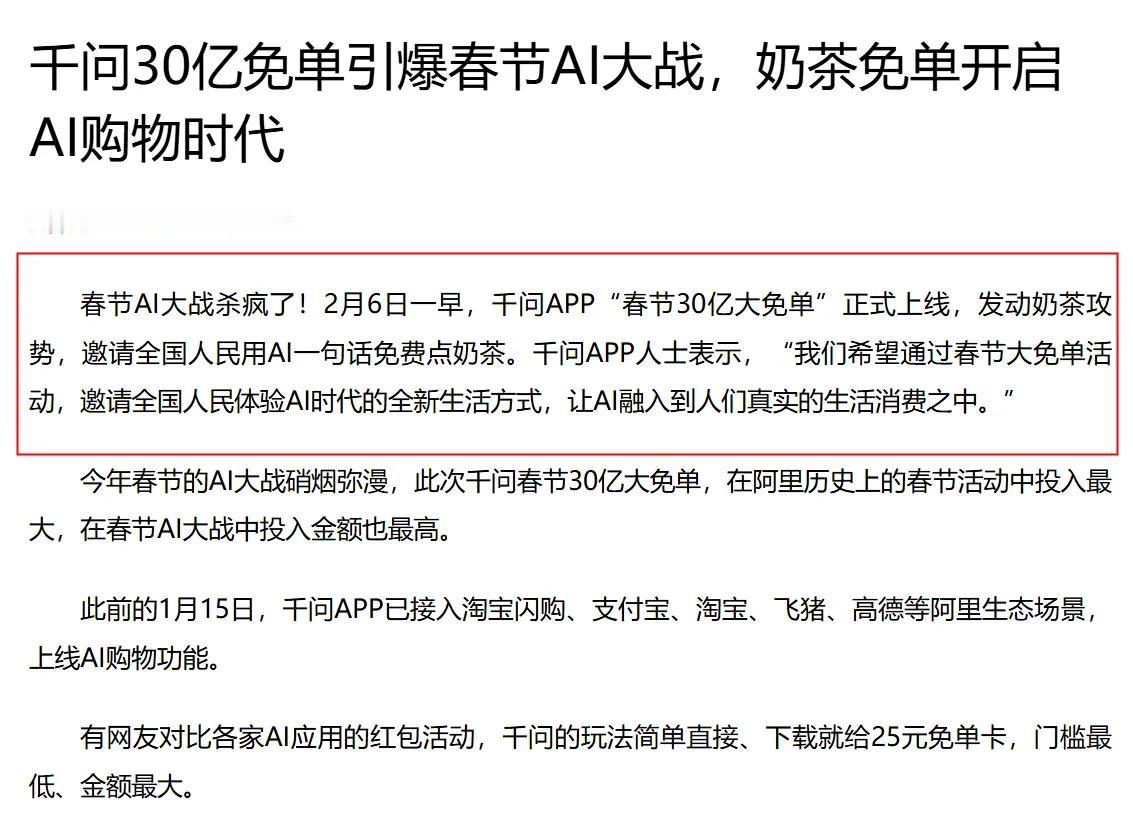 今年的春节AI大战,千问赢面很大,重点有三个! 今天看到新闻说,千问App已经上线了“春节30亿大免单”活动,每个人都能直接领一张25元的免单卡,在全国30多万家奶茶店都可以使用。 相当于直接免费喝一杯奶茶了。 如果邀请新朋友下载千问的话,双方还能再各自得一张免单卡,一整套下来,每个人最高能获得21张25元的免单卡,总金额达525元。 这想想都觉得刺激吧,一个月奶茶费都够了。 而且这还只是第一波,第二波千问直接发现金红包,最高可得2888元,更加刺激。 从这个消息中,咱们其实已经可以看出千问的一个优势了,那就是金额够大,千问投入30亿,是最多的一个,优势明显。 除此以外,千问还有两个独特的优势,一个是办事能力,再一个就是路线优势。 相比于其他家AI单纯只是发红包,主打春节线上聊天,千问玩法更多,而且还能帮我们把线下的事办了。 千问有一个很大的特点,就是拥有办事能力,其接入淘宝闪购、淘宝、支付宝、高德等阿里生态后,已经具备了点外卖、买年货、订酒店等功能,能真正帮我们把事办了。 最后就是路线上的优势,我们会发现,千问搞这么多,要抢的其实不是简单的流量,而是抢AI时代用户的生活消费习惯。这就很不简单了,因为AI时代下,用户消费肯定会往AI方向靠,千问率先拿下,就已经积累下优势了。 不得不说,大战还未开始,战局已经初现端倪,千问怕是要出人意料了!