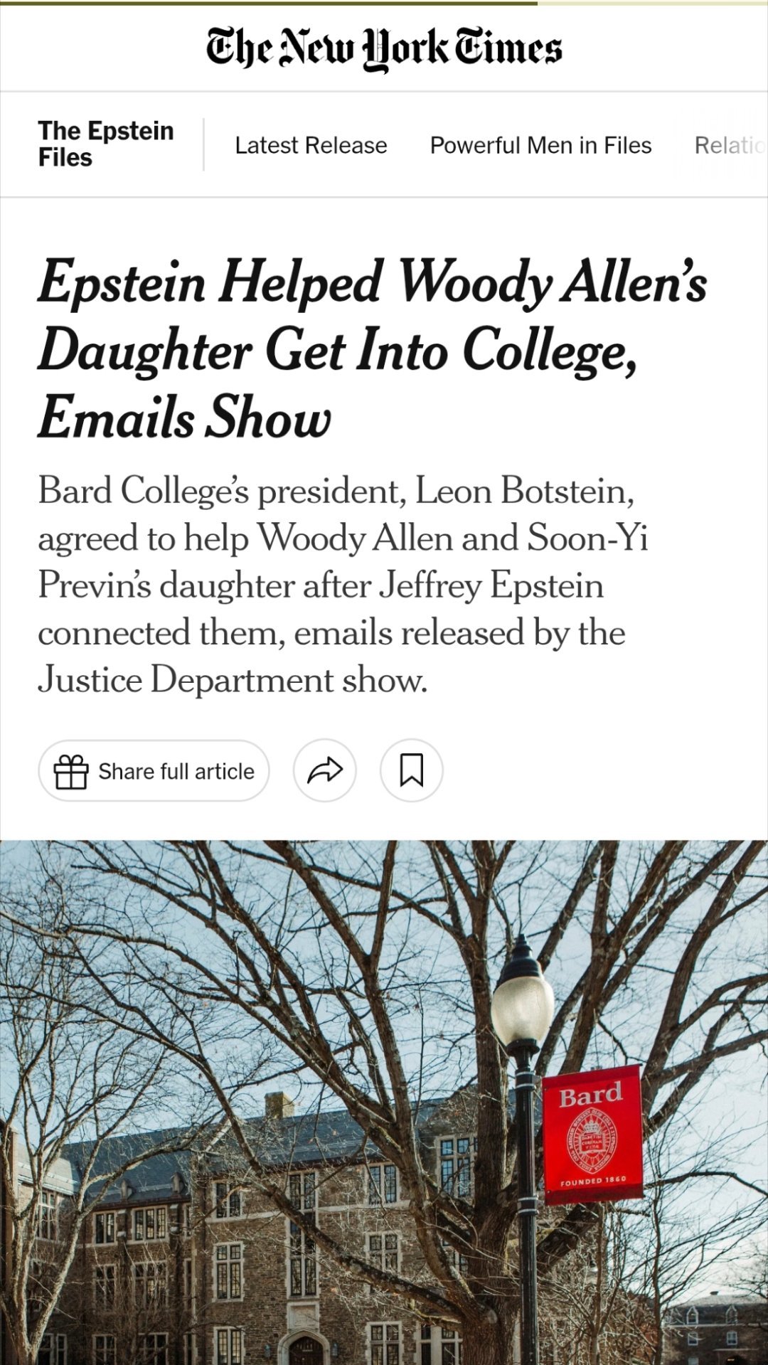 ² 但博主没有讲到为啥伍迪·艾伦的这个妻子,他前妻的养女宋宜,跟爱泼斯坦关系这么近!一个重要原因是,爱泼斯坦是宋宜、伍迪艾伦家的“恩人”!宋宜的女儿就是被爱泼斯坦走后门送进的巴德学院!