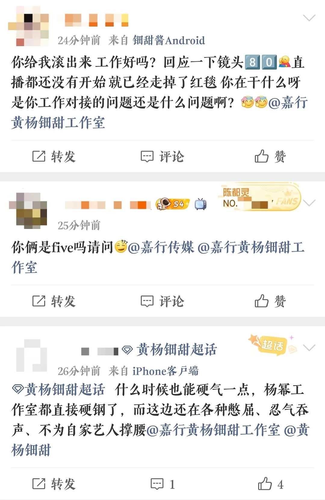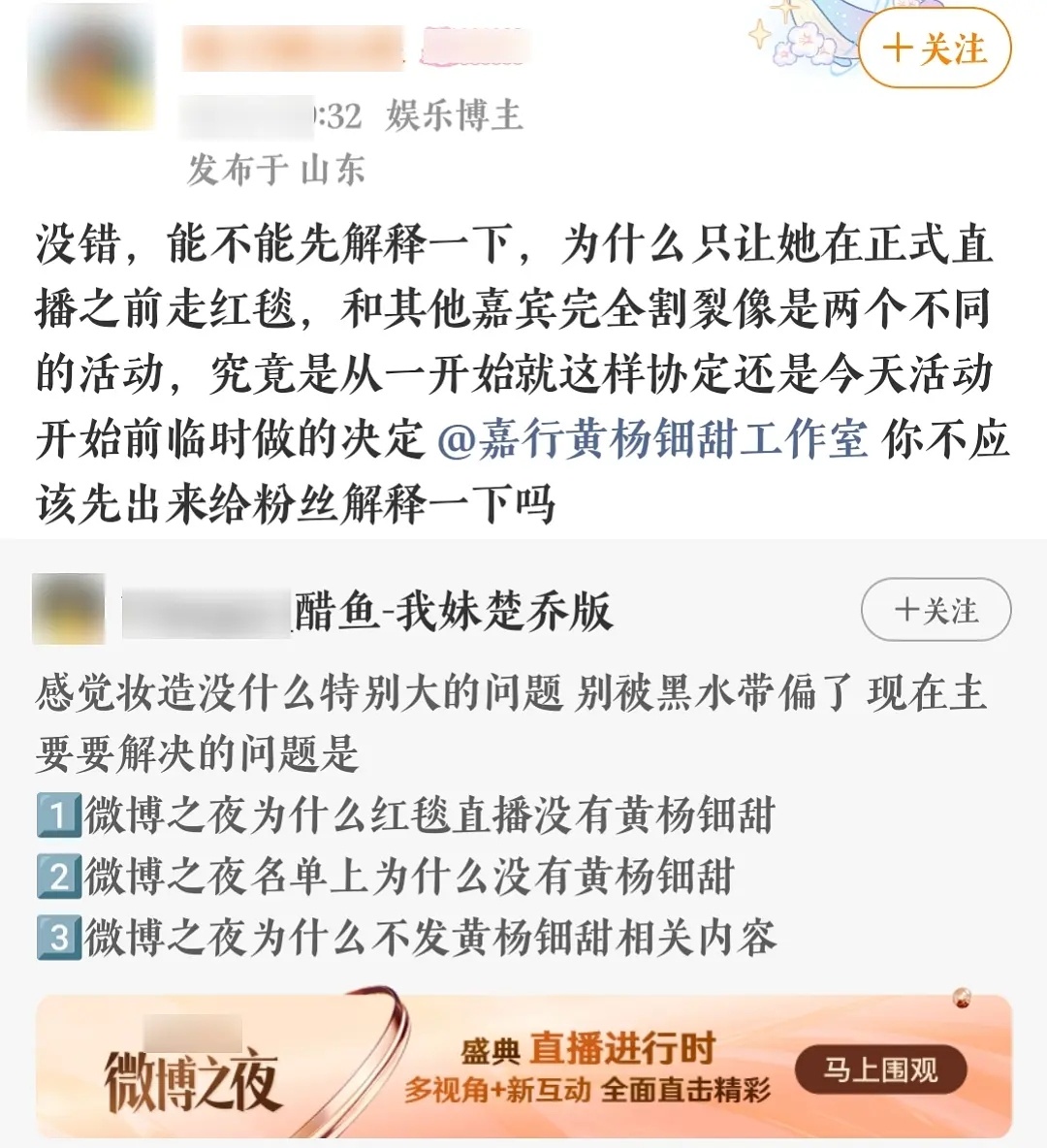 原来昨天黄杨钿甜是红毯直播开始前走的红毯,粉丝维权问工作室为什么微博之夜没有黄杨钿甜名单,也不发黄杨钿甜