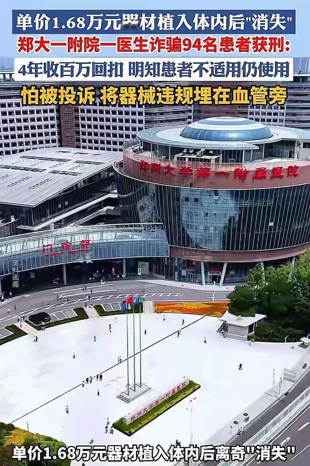河南郑州大学第一附属医院一名黑心医生骗取92名患者205万。2017年患者郑先生意外切伤左手手指,花了10.08万。费用清单显示手术中使用了6个微血管吻合装置。在后来的复查当中,完全没有看到这6个东西。还有患者被支入1.68万的医疗器材,在之后的复查当中也是凭空消失。有些患者根本就不需要植入。被强行植入,强行收费。