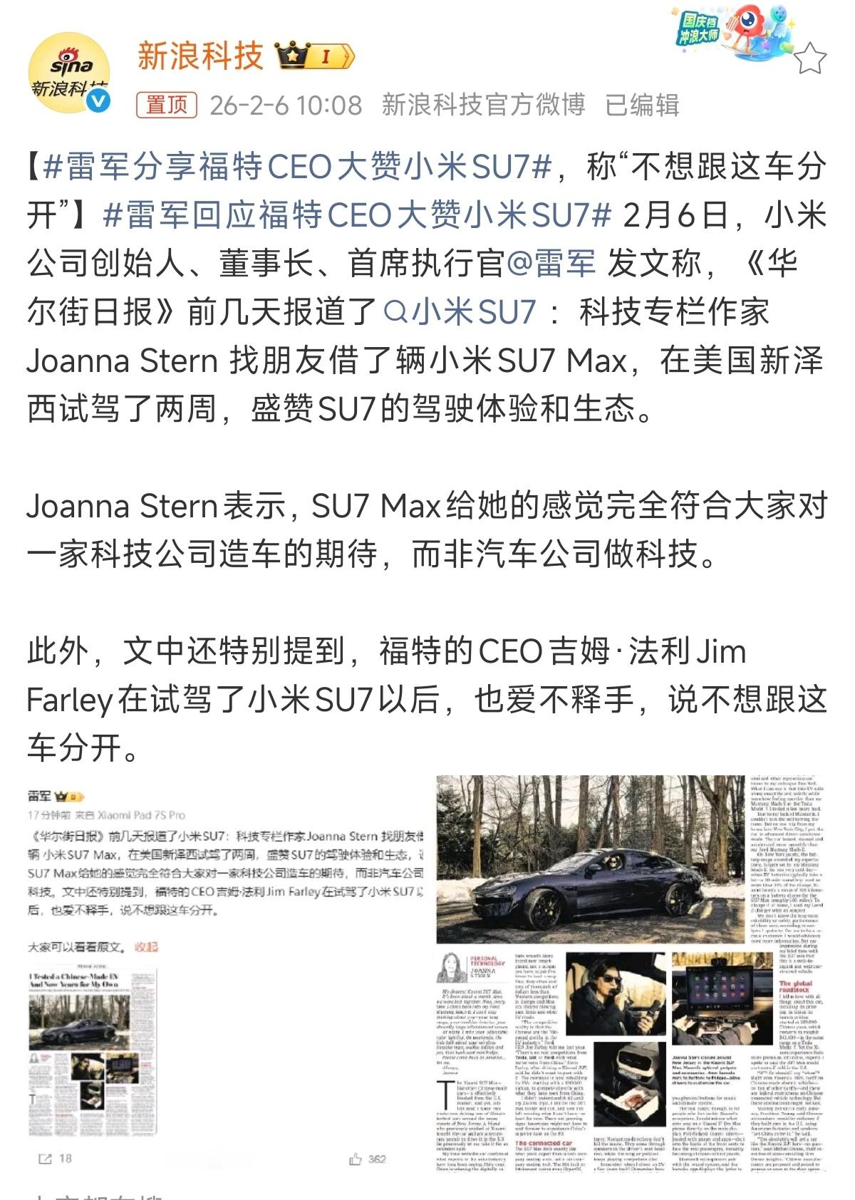 福特的CEO试驾了小米SU7:爱不释手,不想跟这车分开。
