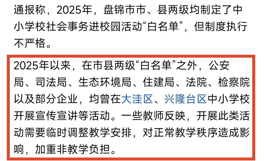 要为盘锦市这份通报点个赞,不留情面。要给中小学校减负,就要减掉这么多单位到学校去频繁宣传宣讲,严管社会事务进校园,该市通报的除了公安局,法院进校宣传宣讲影响正常教学秩序以外,司法局,生态环境局,住建局,法院,检察院以及部分企业都曾经到中小学区进行宣传宣讲。本来进学校进行法制环保等教育是一件好事情,但想一想公安局司法局法院检察院企业排队进校园,对校园正常教学秩序的影响有多大,恐怕要学校的老师才最清楚,学校为了迎接这些宣讲教育,要临时调整课程,一次两次也就罢了,频繁临时调整过程,就是一种不正常的现象。 其实本来是好事,为什么会造成这么多负面影响呢。我觉得有两个原因,第一个原因是一些单位认为进学校进行宣传教育,学校接受是理所当然的。第二个原因是这样的活动组织起来比较轻松,好拍照片也好写工作总结。 我有一个建议,法制教育和环保教育等,完全没有必要临时调整学校的课程影响学校正常的教学秩序,开学就要有规划。比如可利用班会课的时间,组织学生统一学习,而且时间不要超过一节班会课的时间,时间越长效果越差。这样既不影响学校的正常教学秩序,又能取得很好的效果。 不走形式,取得实效,这是最关键的。其实在老师的教育过程当中,已经进行了法制教育和环境教育等等,这些教育已经融入了课程教育之中。教育