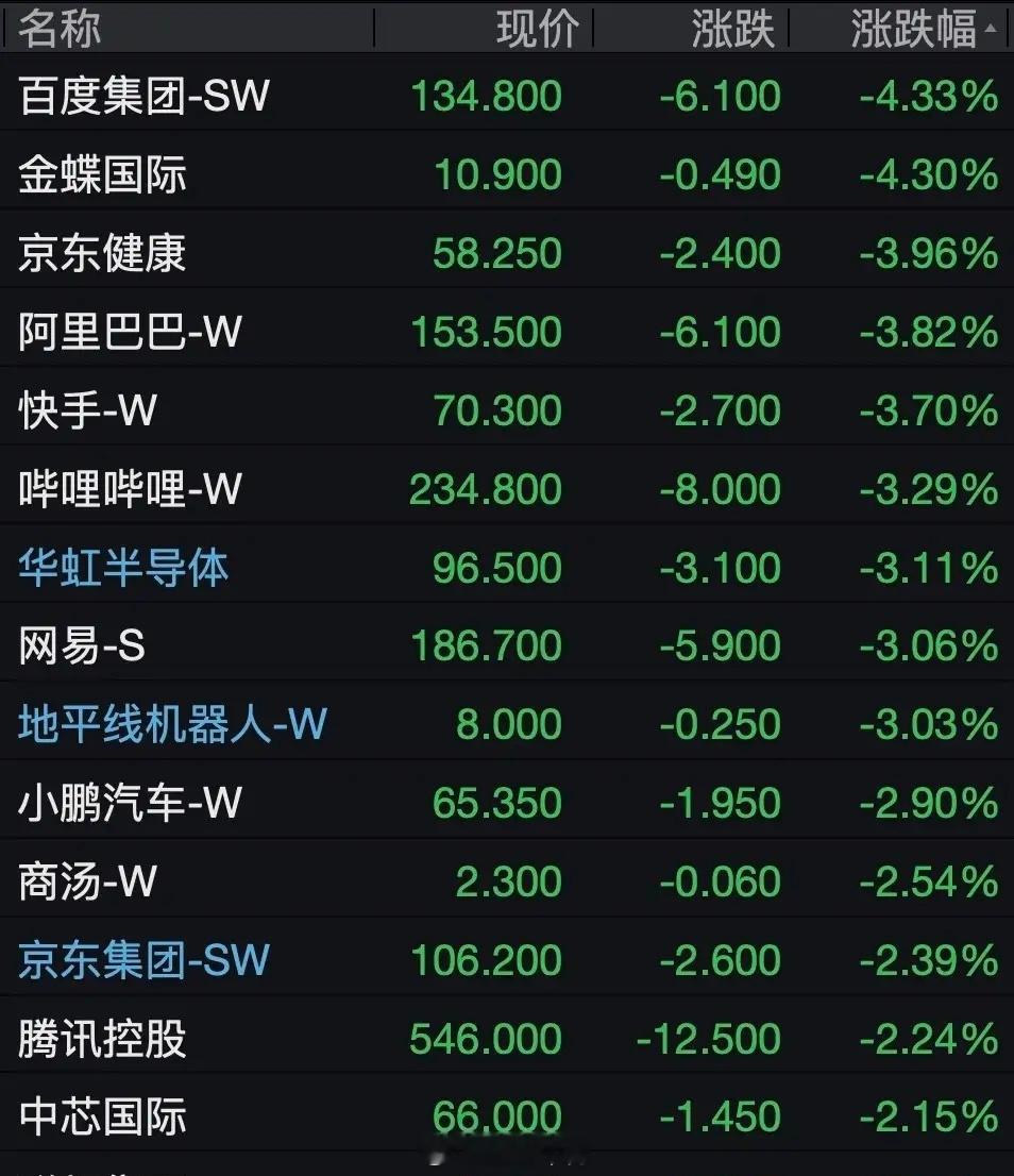 2、科网股全线走低,百度集团跌逾4%,阿里巴巴、快手、哔哩哔哩、网易、华虹半导体均跌逾3%,商汤、京东集团、腾讯控股、中芯国际等跌超2%。