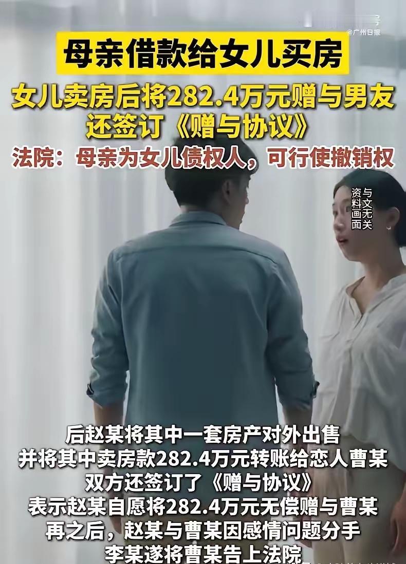合肥一位母亲,拿出积攒的403万给女儿买了两套房,登记在女儿名下。但这位母亲多了个心眼,让女儿当场写了张欠条,明确这钱是借的。 后来,女儿谈恋爱了,私下卖掉其中一套房,把拿到手的282万多房款,转头就全额赠给了男朋友,还签了赠与协议。结果两人没多久分手了,这笔巨款眼看就要不回来。 关键时刻,母亲当初让写的那张欠条起了决定性作用。法院认为,母亲是女儿的合法债权人,女儿在没还母亲钱的情况下,把大笔财产无偿送人,直接损害了母亲的权益。最后判决撤销赠与,男方必须全额还钱。 所以,这事儿给很多家庭提了个醒:父母子女间涉及大额钱财往来,哪怕是出于爱意,事先留个清晰的凭证,比如借条,不是不信任,而是在法律上能给彼此一个重要的保障,关键时刻真能避免人财两空的局面。