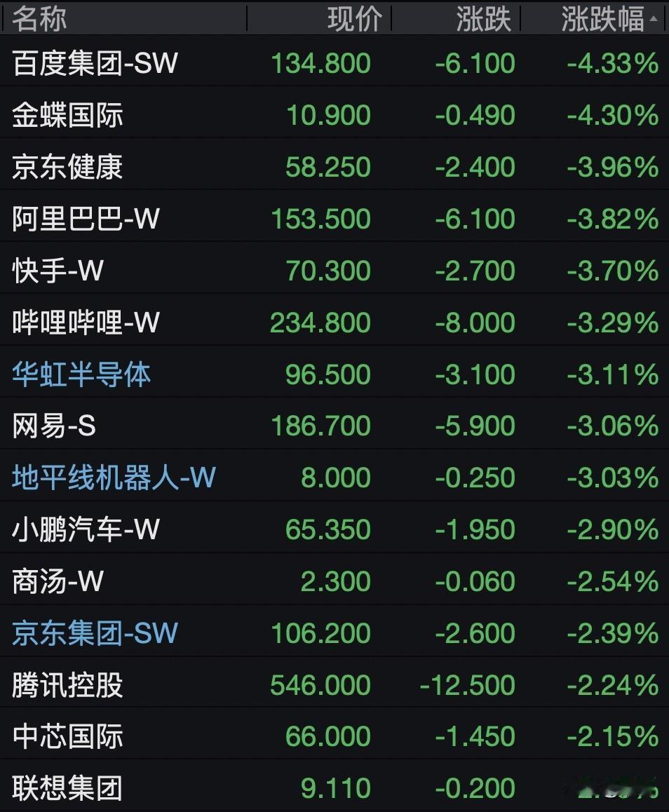 全线下跌,港股和港股科技彻底报废了。港币与美元同振,没有美股的命,却有美股的病。 在美股科技股遭受血雨腥风下跌下,本身已经熊市的恒生科技犹如“屋漏偏逢连夜雨”的悲凉。人家美股是在历史最高位的震荡和调整,大多数美股科技股业绩支撑性很强,市盈率高的也就40出头。而恒生指数和恒生科技已经持续下跌半年,再跌一步就将滑入无尽的深渊了。 看看今天具体情况: 1、香港恒生指数低开1.97%,恒生科技指数跌2.42%。 2、科网股全线走低,百度集团跌逾4%,阿里巴巴、快手、哔哩哔哩、网易、华虹半导体均跌逾3%,商汤、京东集团、腾讯控股、中芯国际等跌超2%。 3、有色金属板块延续弱势,中国黄金国际、江西铜业股份、灵宝黄金、山东黄金等跌超5%。