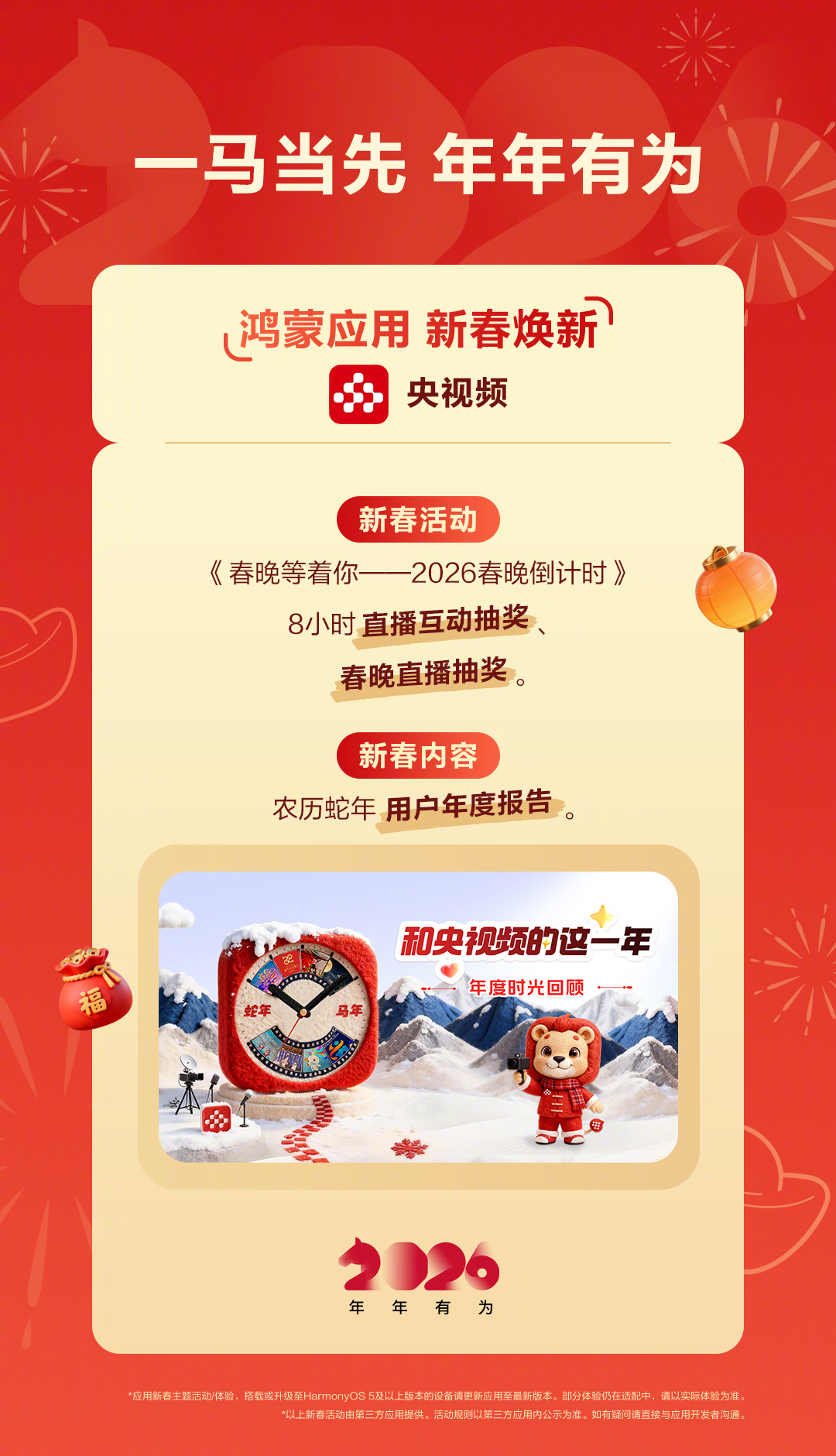 鸿运马上来 不得不感慨,时间过得真快,技术迭代更快。回想去年这个时候,大家还在调侃鸿蒙应用是“毛坯房”,结果今年马年春节一看,好家伙,直接进阶成“精装大平层”了!