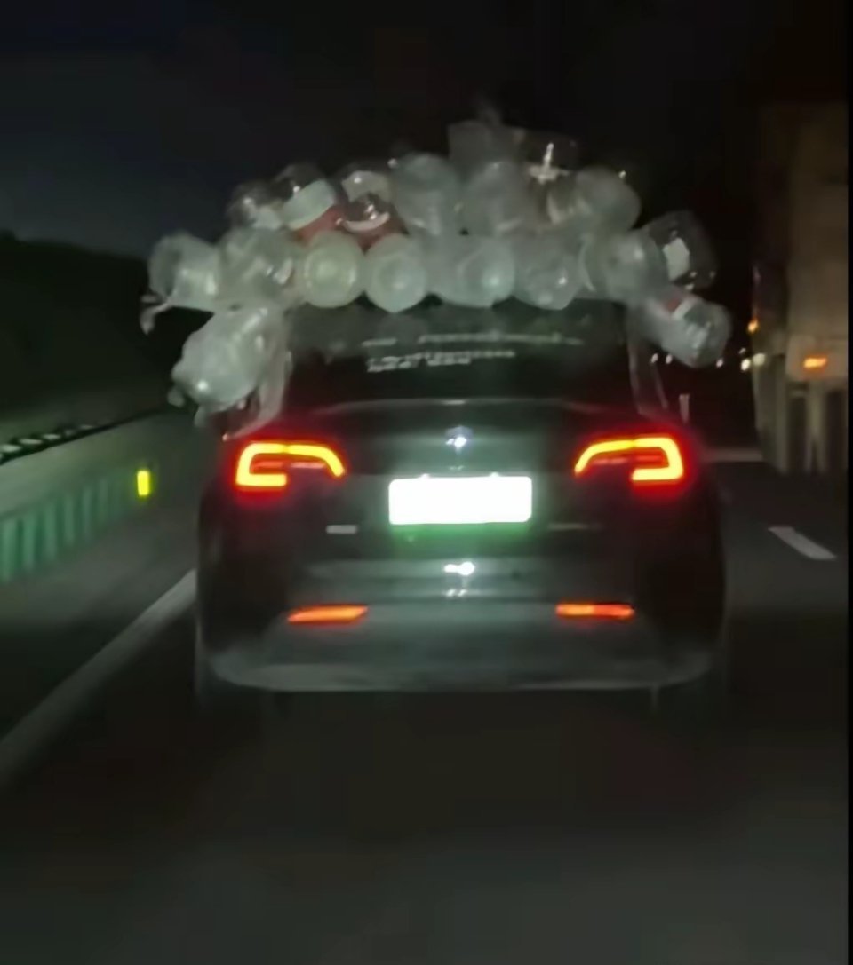 怪事!春节返程的高速路上,一辆特斯拉的车顶上,绑着几十个空矿泉水瓶。真让人纳闷,要说这人没钱吧,他能开着特斯拉在高速上跑一千多里去浙江;可要说他有钱吧,居然在春节返程的车上攒这么多空矿泉水瓶回老家,这到底是要干啥呀?