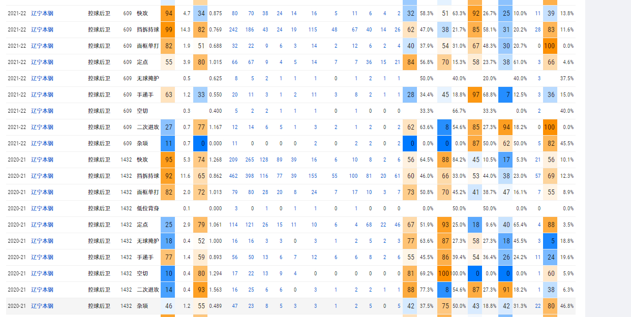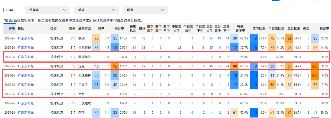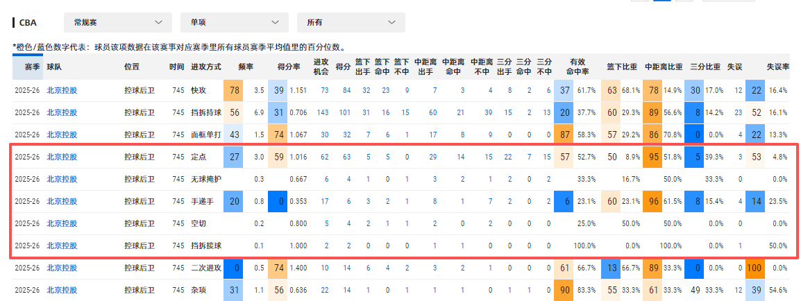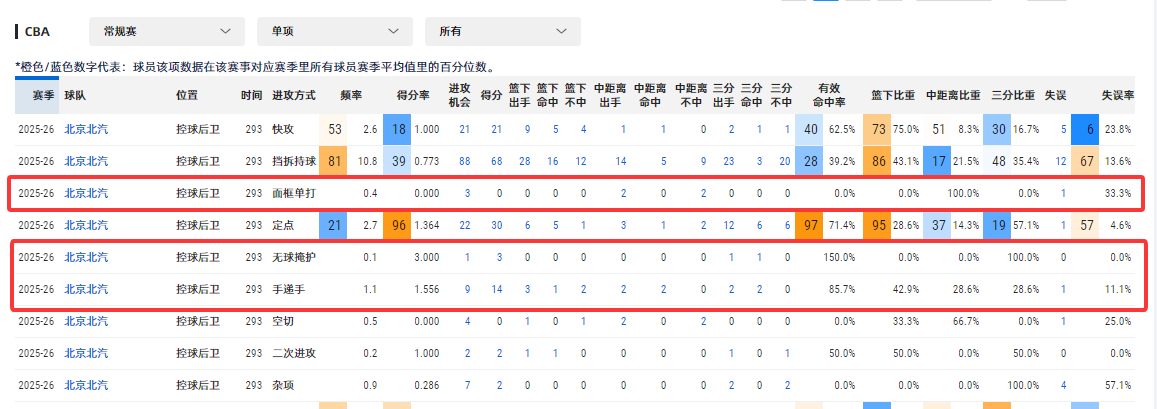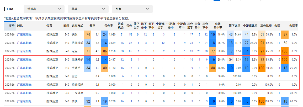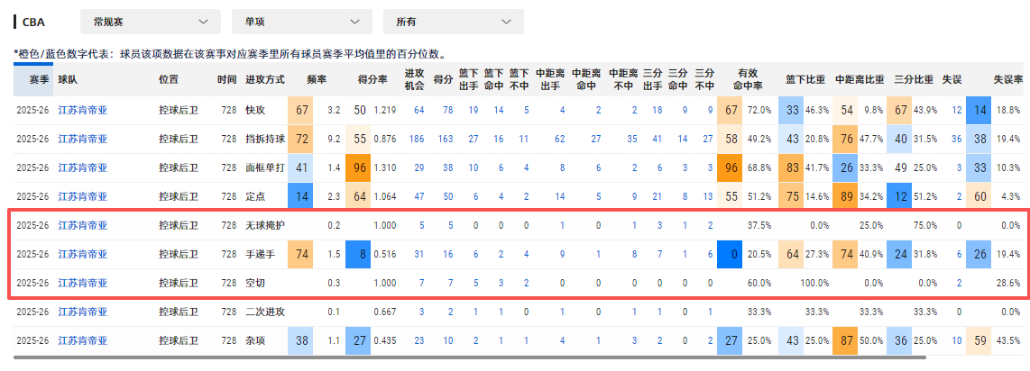 无球进攻层面,所有后卫都打得不多。手递手、无球掩护、空切、挡拆接球比重、数量都很少。其实我们家明明都是些偏分卫的后卫,结果分卫的内容倒是很少打,也是挺神奇的。