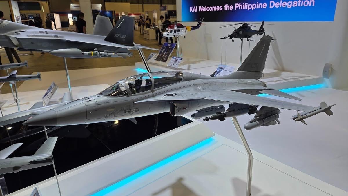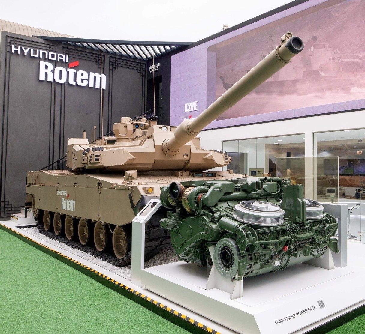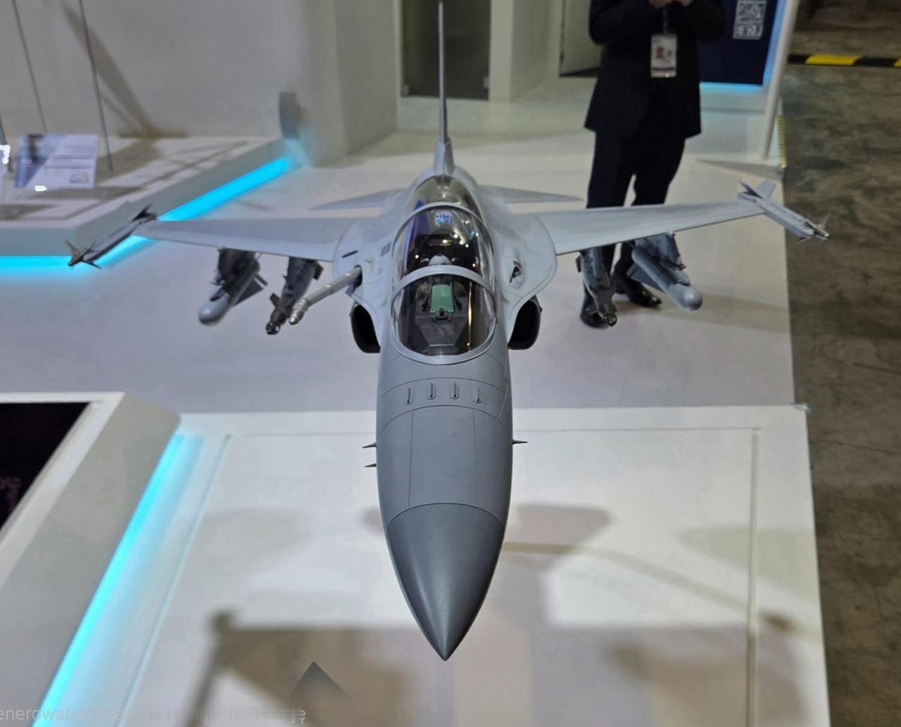 韩国航空航天工业公司(KAI)在新加坡航展上展示了FA-50双座战斗机的模型。同时亮相韩国展区的K-2坦克。