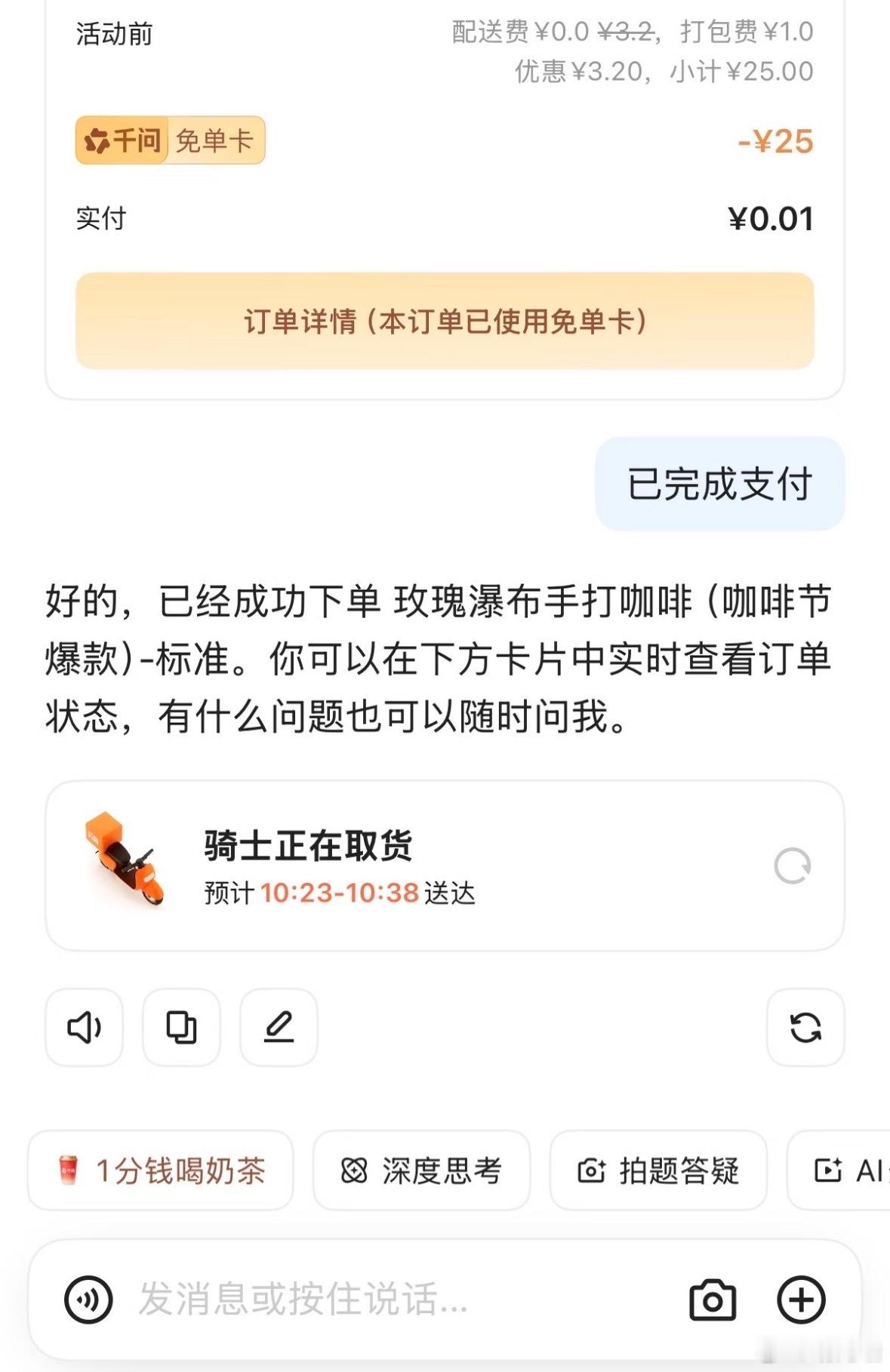 0.01奶茶真香,千问挺好用哈,自己家里人朋友互相拉可以免费喝!!挪瓦为咖啡人喊话千问免单咖啡