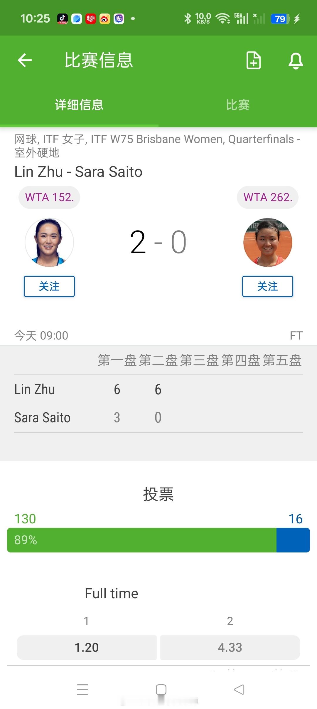 小花小草资讯 【布里斯班W75】四分之一决赛四号种子朱琳🇨🇳6-3/6-0横扫🇯🇵球员斋藤咲良晋级四强半决赛对阵头号种子吉布森收获29分,即时排名第145位(+7)