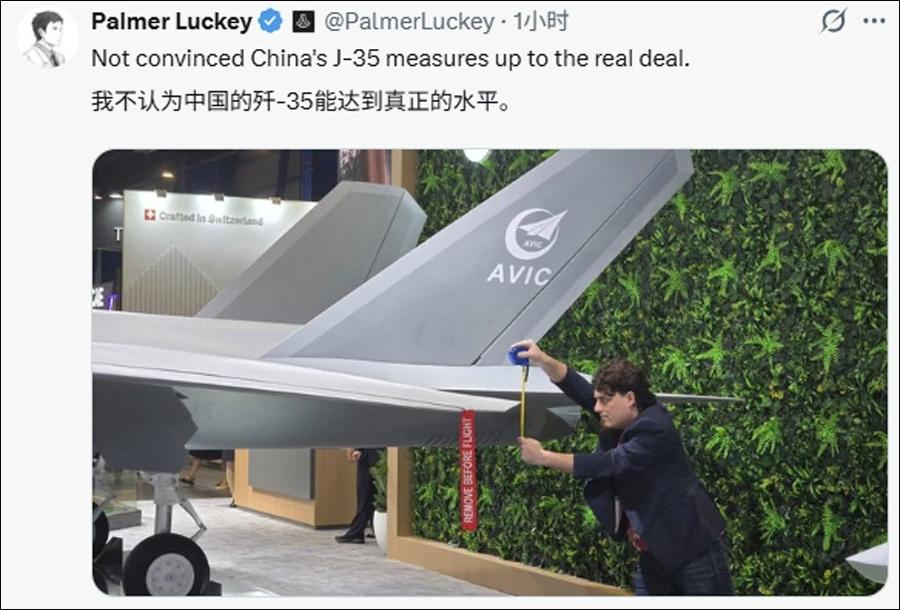 美国众泰的皮尺部[呲牙][大笑] 第十届新加坡航展现场 美国安杜里尔工业公司 创始人“帕尔默·拉奇” 在中航的展台上 用卷尺量歼35A的缩比模型 获取相关测量数据。