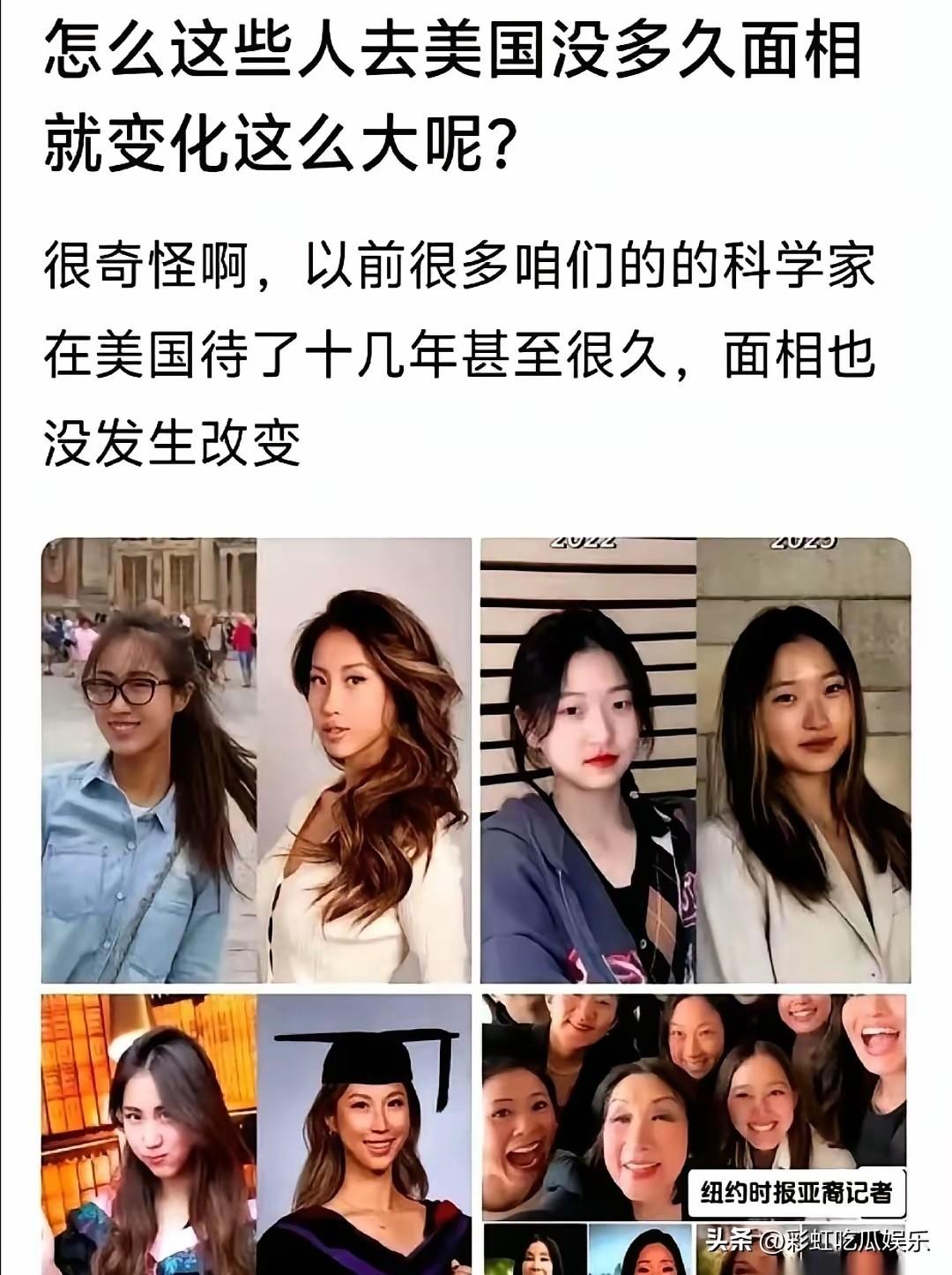 为什么很多人到了美国以后面相都变了,从鹅蛋脸变成三通脸,整个脸都宽了嘴巴也变大了。 而且她们的妆容都是眯眯眼大饼脸加上大嘴巴,这些都是为了讨好西方人,那崇洋媚外的笑容让人不适。 我们都要教自己的孩子爱国,出国留学不再是镀金,很多时候是渡劫。