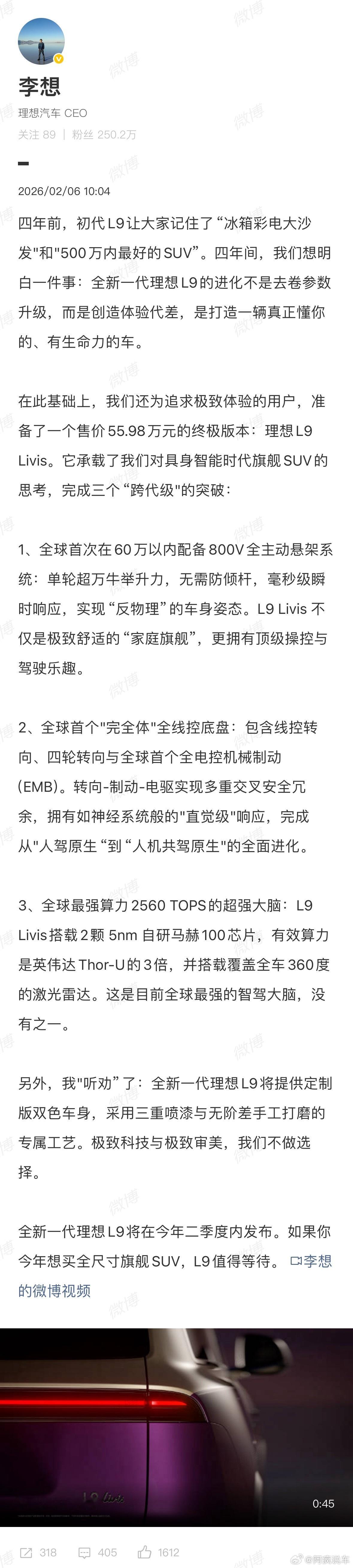 而且这次还特地推出了理想L9 Livis版,具体的配置还是非常强的。而且这次的李想还听劝了一波,全新理想L9提供定制版双色车身,给大家多了一个选择。