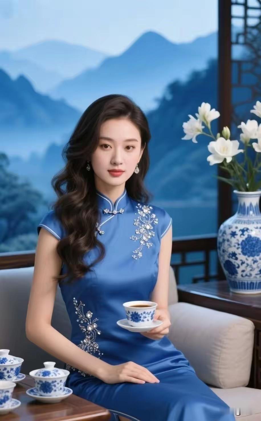 优雅蓝旗袍,静享茶时光,品味东方韵味。
