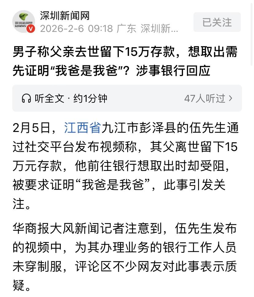 江西九江,男子父亲去世后留下15万存款,他着急用钱给父亲下葬,就去银行取钱,结果柜员让男子证明“我爸是我爸”,否则钱取不出来。男子无法理解,说我和我爸在一个户头上,这还不能证明吗?银行:没公证就把15万给出去,万一后面冒出来个私生子或者其他兄弟姐妹,这责任谁担得起? 伍先生的老父亲在2月2号走了。 老人家尸骨未寒,留下的15万块钱还存银行。结果伍先生去取钱时,却被银行的一句话给噎住了。 对方的意思就是,得证明你爸是你爸,这钱才能取出来。 伍先生无奈极了。家里条件本来就紧巴,父亲这一走,全家人都在为后事发愁,就指望着这15万块钱救急。 他想着先取出来给老人置办寿衣、棺材,让老人早点入土为安。 5号一大早,伍先生叫上家里的亲戚,带着户口本、父亲的身份证、自己的身份证,去了银行支行。 本以为证件齐全,取钱那就是板上钉钉的事,结果柜台里的人翻看了一阵,说这钱取不了,得去公证处开公证,证明你们的父子关系。 伍先生当时就懵了,紧接着火气直往上窜。 他指着户口本说,户口本上写得清清楚楚,我和我爸在一个户头上,这还不能证明吗?我爸还在等着这笔钱下葬,你们让我现在去办公证,公证处办事不要时间吗?这不是故意难为人吗? 可不管伍先生怎么急,怎么求,银行的工作人员始终一句话:这是规定,超过5万就得公证,我们也没办法。 伍先生心里憋屈坏了,父亲辛苦一辈子攒下的钱,临了想取出来送老人最后一程,竟然卡在这一纸证明上。 而且,这笔钱分成了5张存单,其中有一张2万块的已经到期了,结果还是取不出来。 他忍无可忍,把事情曝光在网上。 这视频里,给他办业务的那个银行人员,连个制服都没穿。 有人就怀疑这银行被外包出去了,要不咋这么多阻碍呢? 事情发酵后,该支行也坐不住了,赶紧出来回应。 支行的工作人员解释说,大家可能误会了,并不是故意要刁难人,非要搞什么“证明我爸是我爸”的奇葩证明。 银行方面说,按照监管部门的硬性要求,存款继承分两种情况:5万块钱以下的,算是小额继承,家属拿着死亡证明、身份证、能体现亲属关系的户口本或者结婚证,签个承诺书,基本就能取走。 但是,只要金额超过5万,哪怕是5万零1块,都属于大额继承,为了防止以后有其他继承人找麻烦,也为了保护储户的资金安全,必须得有公证处的继承公证书。 工作人员也挺委屈,说我们也是按章办事,如果没公证就把15万给了一个人,万一后面冒出来个私生子或者其他兄弟姐妹来找银行赔钱,我们谁担得起这个责任? 至于视频里工作人员没穿制服的问题,银行说这是他们新员工,工服还没来得及发放就上岗了。 这件事在伍先生看来,父亲刚去世,家里急等钱用,户口本就在眼前,银行应该有点人情味,特事特办。 但在银行看来,制度就是高压线,尤其是涉及大额资金,少一个章都可能惹上官司。 伍先生最后也没取到钱,只能先想办法办公证。这一来一回,不仅要跑腿,还得花公证费,更重要的是,老人的后事还得往后拖。 那从法律角度来看,银行做法有问题吗? 《银行办公厅关于简化提取已故存款人小额存款相关事宜的通知》(银保监办发〔2021〕18号)第2条规定:已故存款人账户存款余额超过1万元的,商业银行应当要求申请人提交继承公证书或法院生效法律文书。 伍先生父亲的遗产总额为15万元,且是以5张存单的形式存在。 虽然其中一张2万元的存单已经到期,但根据上述监管规定,判断是否需要公证的标准是已故存款人在该银行的账户总余额,而非单笔取款金额。 因为15万元远超1万元的“小额”门槛,银行要求伍先生提供继承公证书,完全符合监管部门的强制性规定,并非银行故意刁难。 伍先生认为银行要求“证明我爸是我爸”是多此一举,因为户口本已经显示了亲属关系。 但从法律角度看,银行面临的核心风险不是“身份真实性”,而是“继承权的唯一性”。 银行无法通过户口本判断是否存在其他隐形继承人或遗嘱继承人。 如果银行仅凭户口本就支付了15万元,一旦后续有其他合法继承人主张权利,银行将面临赔偿责任。 因此,公证处的《继承公证书》实质上是法律认可的“免责金牌”,用来确认唯一合法继承人。 这个法条旨在保障资金安全,但执行中可能暴露了“刚性过强”问题。 伍先生家庭困难、急需丧葬费,却因公证流程耗时陷入困境,还是需要优化呀! 有人说,家里老人如果有存款,最好是在神志清醒的时候,把密码告诉子女,或者立个遗嘱,哪怕是去公证一下,也比将来子女在悲痛中还要为了证明“我爸是我爸”而跑断腿要强。 对此,你怎么看? 关注@运良说法 学法律知识不迷路