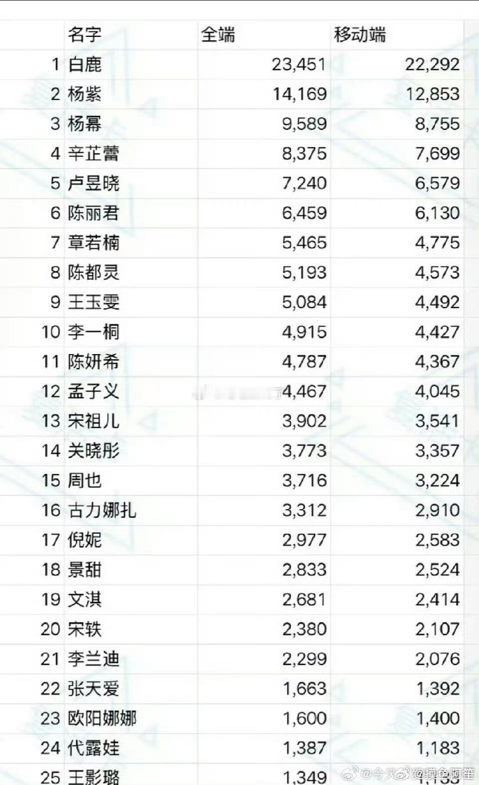 昨天微博之夜女明星百度指数,白鹿第一,杨紫第二,杨幂第三。