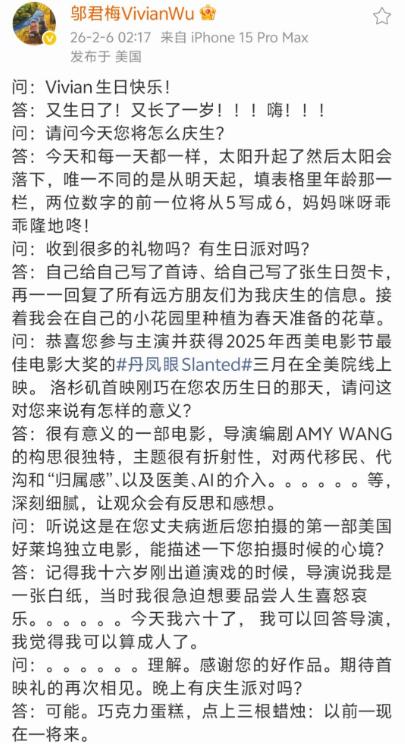 邬君梅60岁生日自爆丈夫病逝!2月6日,邬君梅发文为自己庆祝60岁生日。在文中,邬君梅首次谈到古巴出身的美籍丈夫奥斯卡已病逝。 这也是邬君梅第一次在公众面前提及这件事。 她只是用平静的文字,诉说着这段无法逆转的离别,可越是平静,越让人觉得心疼。 提起邬君梅,大家脑海里浮现的,大概率都是她在荧幕上那种自带气场、从容不迫的模样。 不管是端庄大气的贵妇,还是干练利落的职场人,她都能演绎得入木三分,仿佛天生就带着一种让人无法忽视的魅力。 但很少有人知道,在这份光鲜亮丽的背后,她有着一段长达近三十年的深情婚姻,而这段婚姻的男主角,就是奥斯卡。 两人的相遇,充满了缘分的巧合,更藏着细水长流的温柔。 邬君梅性子爽朗直率,说话做事不绕弯子,身上有着上海姑娘的灵动与洒脱;奥斯卡则温柔细腻,心思缜密,自带古巴人的热情与浪漫。 当时他们拍戏的地点在加利福尼亚,恰逢寒冬腊月,气温低到让人难以忍受,片场的工作人员们个个冻得双手通红,连拍戏时都忍不住打哆嗦。 奥斯卡看在眼里,记在心里,每天开工前,都会提前准备好一堆暖宝,先用自己的双手把暖宝搓得温热,再一个个送到工作人员手里。 每递一个,都会笑着说一句暖心的话,邬君梅自然也收到了这份专属温柔。 有一次拍戏间隙,邬君梅和剧组的人闲聊,开玩笑说,在中国有个习俗,演员要是演那种需要“离世”的角色,剧组都会给个小红包,图个吉利,讨个好彩头。 说者无心,听者有意,邬君梅也就是随口一提,没放在心上,可奥斯卡却牢牢记住了。 那天收工后,他翻遍了整个摄制组,好不容易找到了一块红色的布料,又亲手一针一线缝了一个小小的红包。 就是这份笨拙又真诚的细心,彻底打动了邬君梅,也让两人的感情迅速升温,从同事变成了恋人。 很多人都说,娱乐圈的感情脆弱又易变,可邬君梅和奥斯卡,却用几十年的陪伴,打破了这个魔咒。 婚后的他们,感情一直十分和睦,还定下了一个特别温暖的约定——两个人分开的时间,绝对不能超过21天。 邬君梅在演艺道路上一路前行,拍摄了很多经典的作品,塑造了一个又一个让人印象深刻的角色。 除此之外,她还涉足好莱坞,拍摄了不少优秀的好莱坞作品,成为了连接华语影视和国际影视的重要桥梁。 而这一切的成就,都离不开奥斯卡在背后的默默付出和支持。 虽然没有自己的亲生孩子,但邬君梅并没有遗憾,因为她和奥斯卡前妻的两个女儿,相处得十分融洽,就像亲生母女一样。 两个女儿从小就特别尊敬邬君梅,也特别喜欢她,不管有什么心事,都会愿意和邬君梅分享。 从2022年开始,邬君梅就慢慢减少了自己的拍戏数量,甚至一度淡出了公众的视野,很少更新自己的社交动态,也很少出现在各种活动场合。 那段时间的邬君梅,几乎把自己所有的精力和时间,都放在了照顾生病的奥斯卡身上。 她放下了自己热爱的演艺事业,放下了身边所有的琐事,一心陪伴在奥斯卡身边,照顾他的饮食起居,陪着他看病、治疗,陪着他度过了最艰难的时光。 那段日子,对邬君梅来说,无疑是痛苦又煎熬的。 可她从来没有在公众面前抱怨过一句,也没有透露过任何关于奥斯卡生病的消息,只是默默承受着这一切,用自己的力量,守护着自己最爱的人,陪着他走完了人生的最后一段旅程。 对于这件事,您有什么想说的吗?欢迎评论区留言讨论。