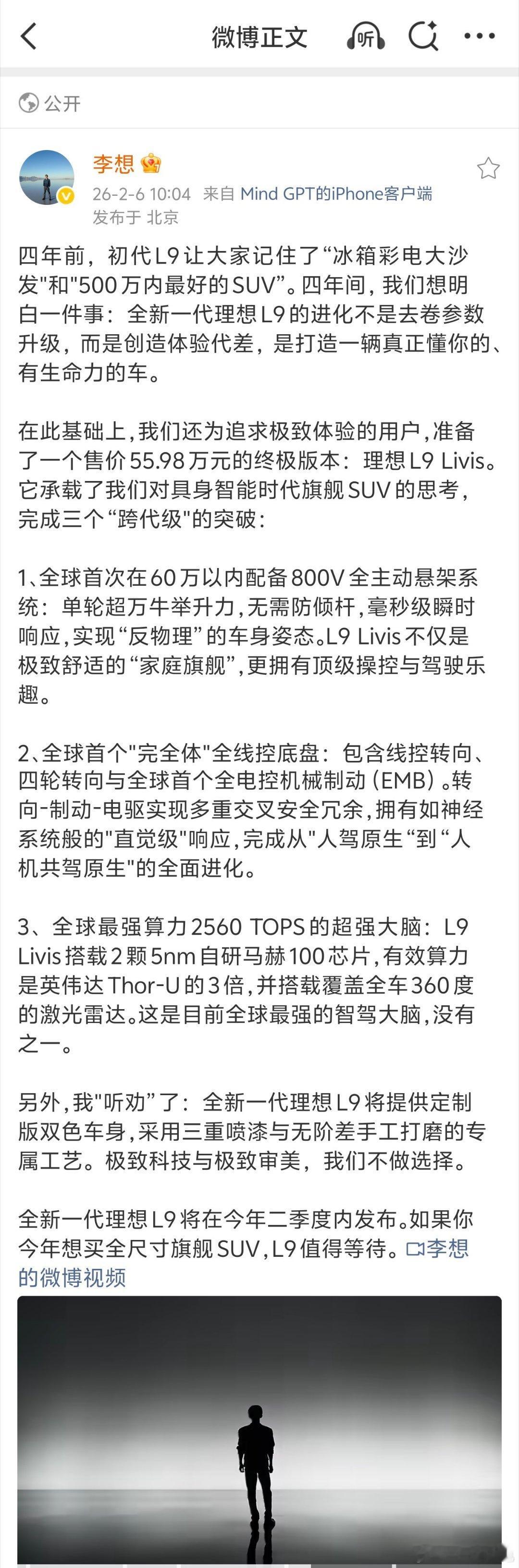 开年李想直接放大招了,55.98万的理想L9 livis全主动悬架,全电控底盘,emb全电控机械制动,两颗自研的5nm芯片,达到2560tops,好东西全掏出来了呀